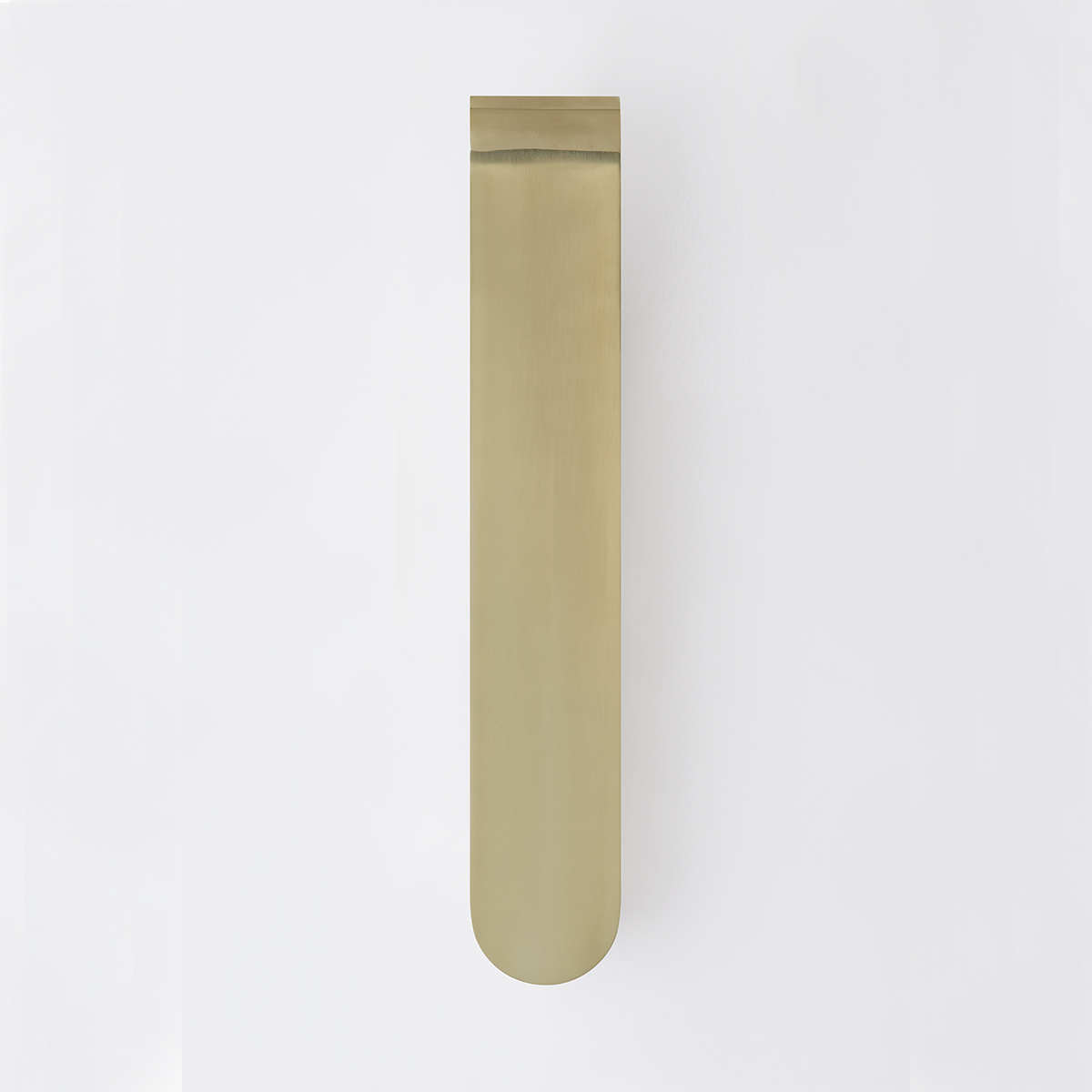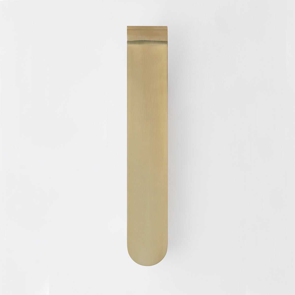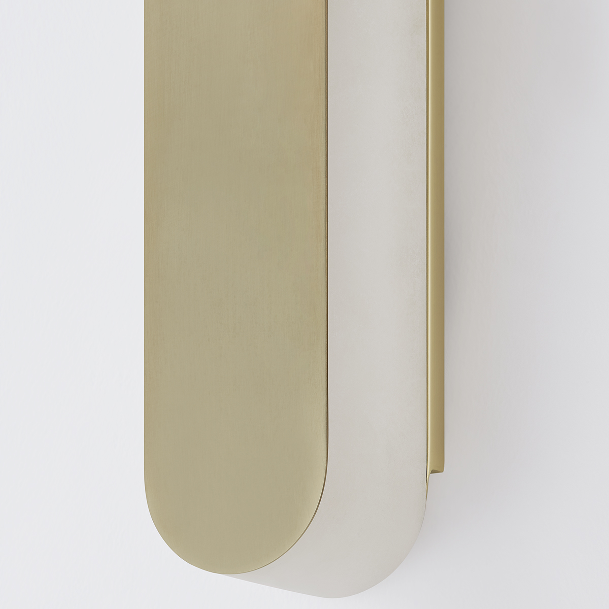 The lines of a curved piece of Aged Brass or Black Brass flow effortlessly into the smooth lines of an alabaster shade creating a sleek, modern form that draws the eye. Light fills the alabaster and emits a soft glow from the sides of the fixture. This versatile sconce is available in both a slender and stout shape and can be mounted for uplight or downlight.