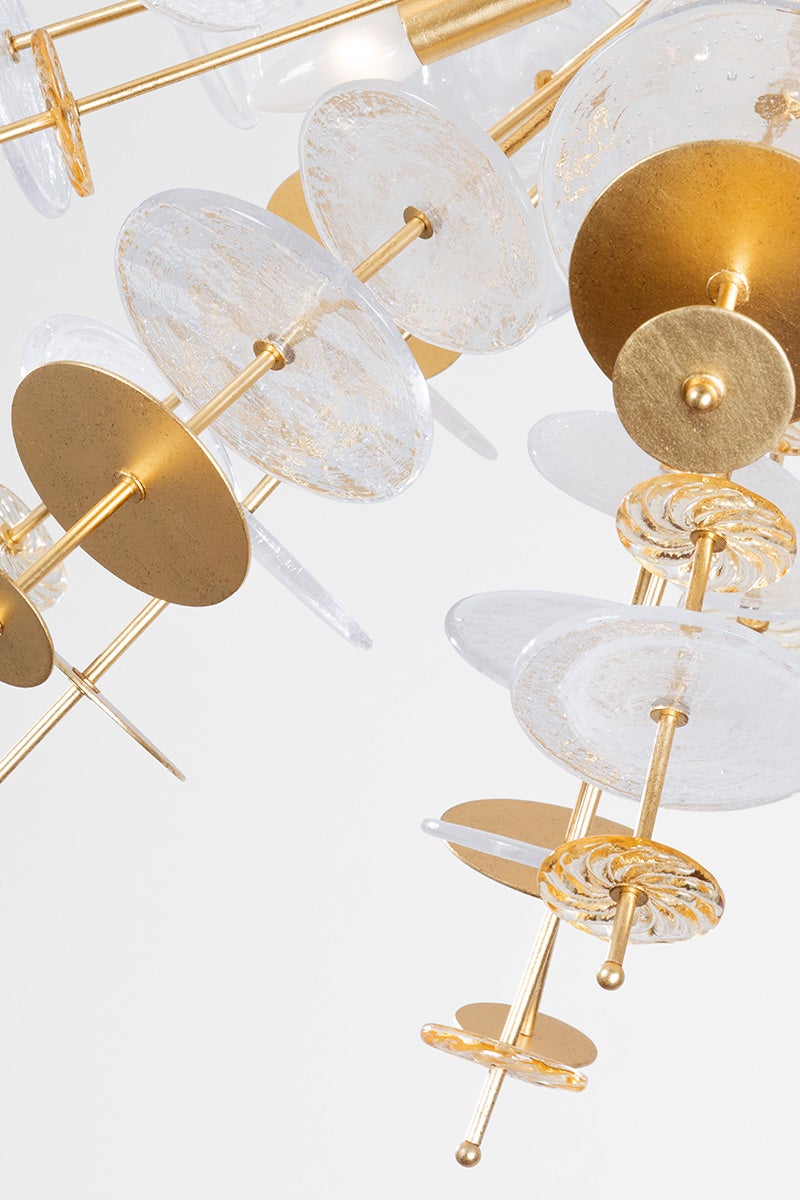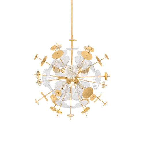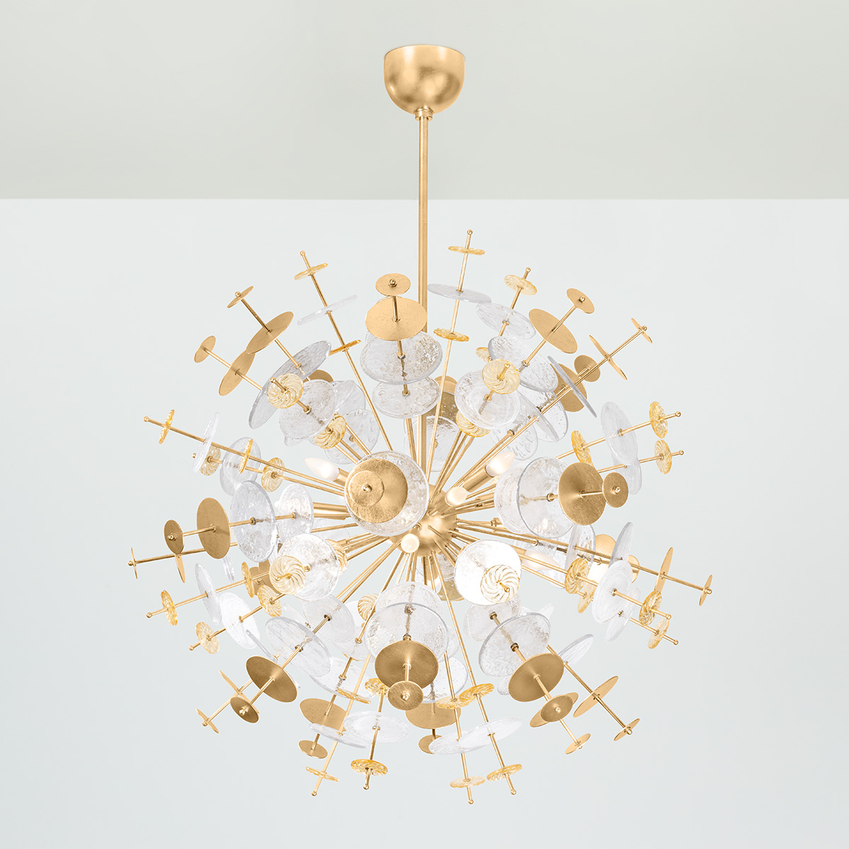 More than a chandelier, Gleason is a contemporary work of art. With a futuristic Sputnik design, it features a burst of Vintage Gold Leaf spokes adorned with decorative cast glass and gold discs. The interplay between reflection, refraction, and transparency creates a compelling display of light. Available in two sizes, it provides a compelling statement piece.