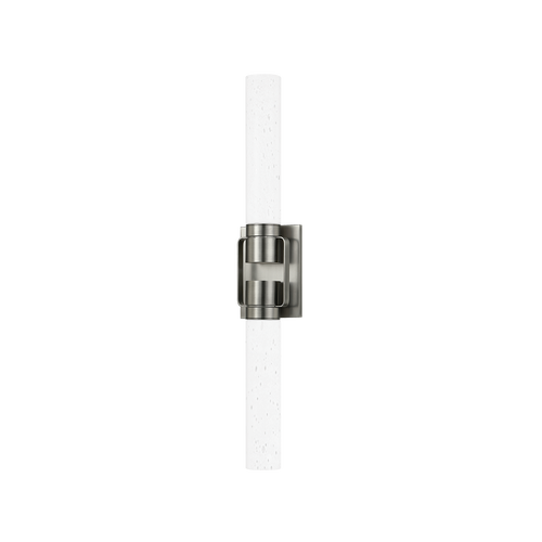 A minimalist silhouette is elevated by mechanical metalwork in Glen Oaks. This narrow sconce features two cylinders of seedy opal glass attached to a slim rectangular backplate. Adding a clean-lined detail, the two socket cups are connected with slender metal straps. Whether in the Aged Brass or Vintage Pewter finish, Glen Oaks brings elegant simplicity to a bath area.