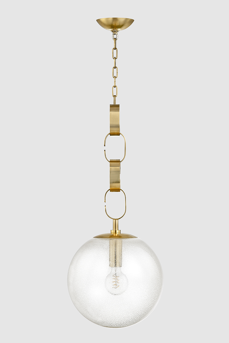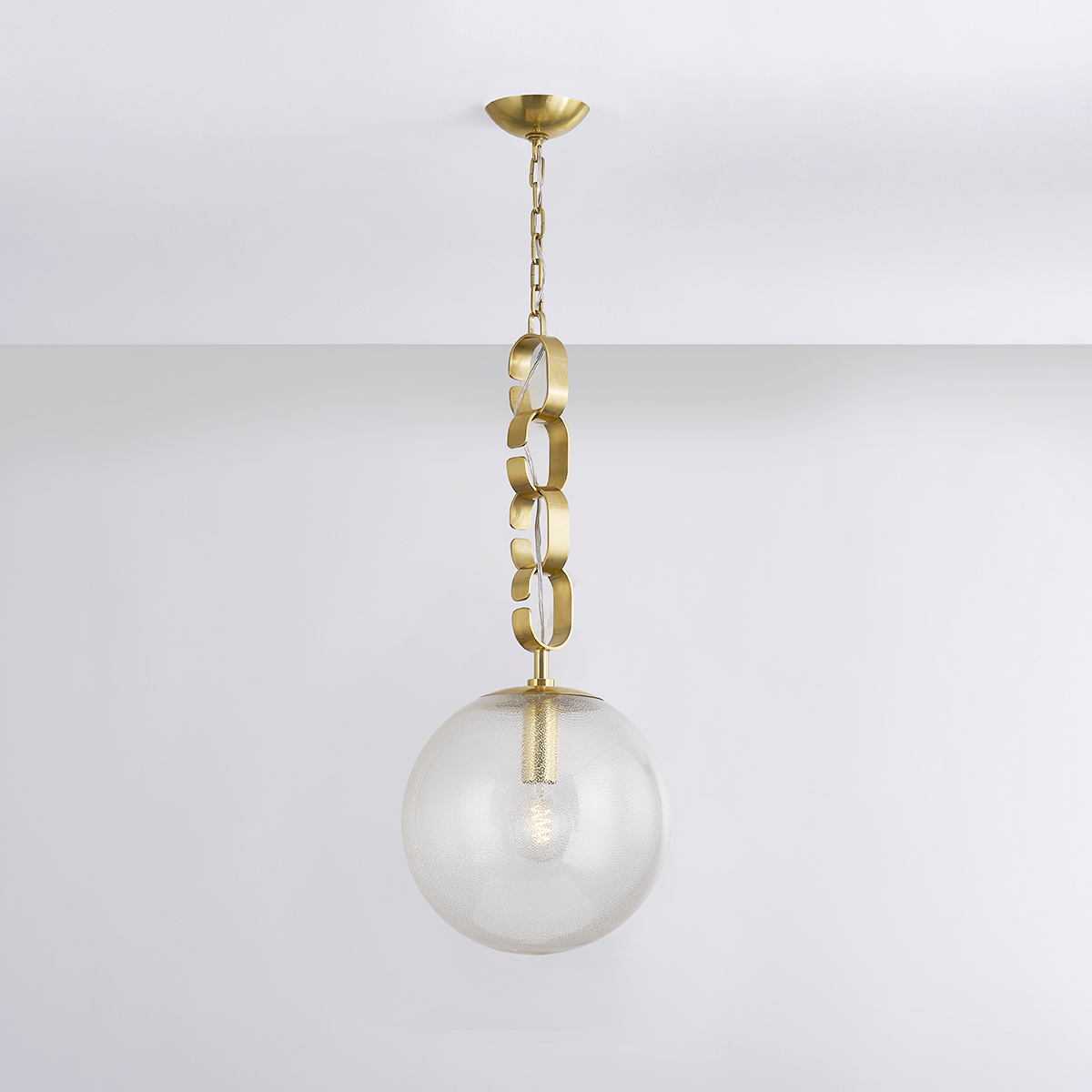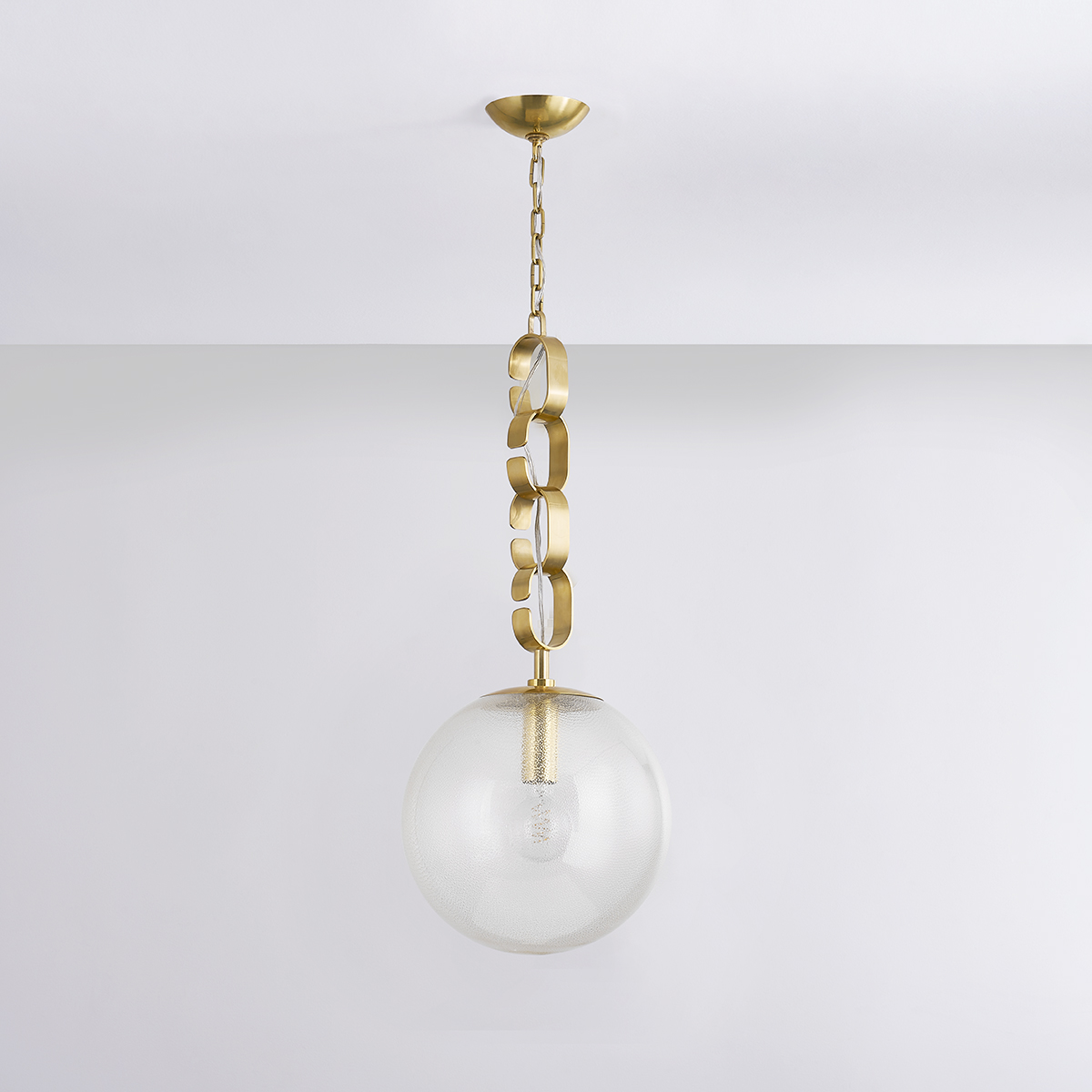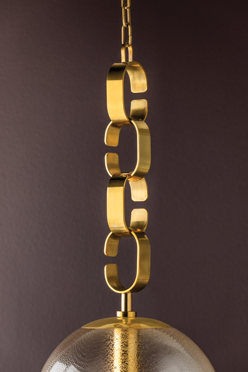 Drawing inspiration from the opulence of the 1930s, this fixture is comprised of seeded glass orbs suspended by chunky Vintage Brass chains. The uniquely colored and swirled glass, coupled with the vintage-inspired forms creates a stunning fixture with high decorative flair. Nessa glimmers with warmth, whether as a chandelier or a pendant light in two sizes.