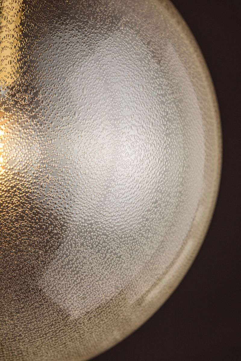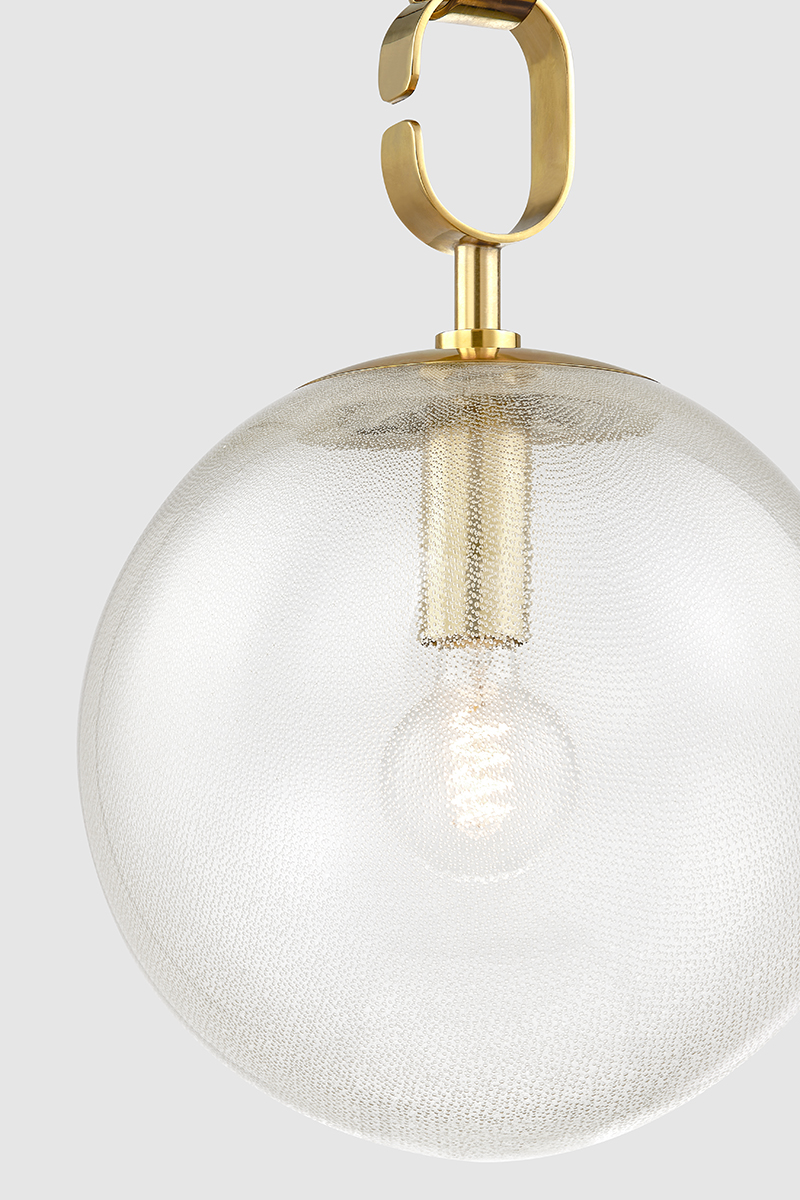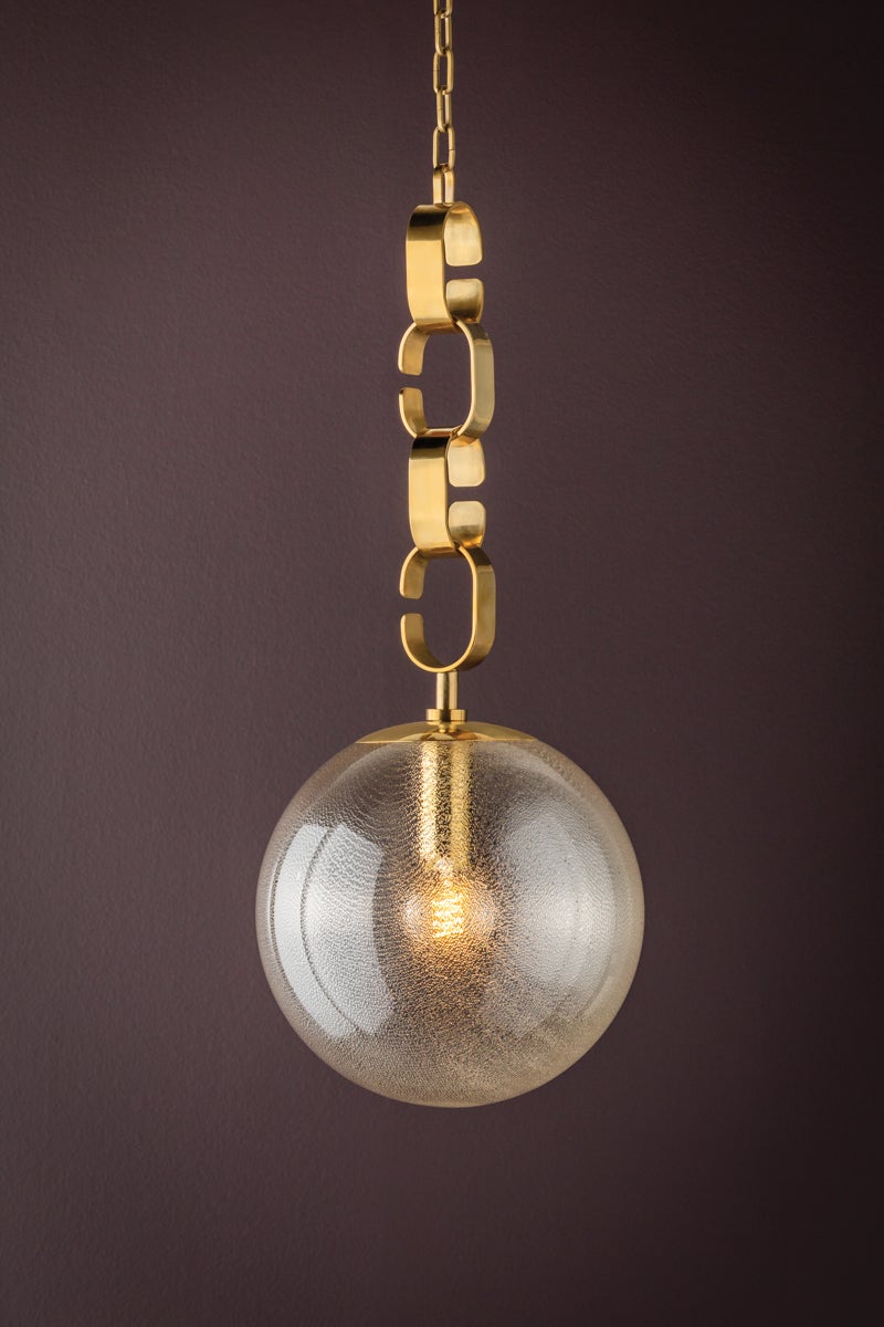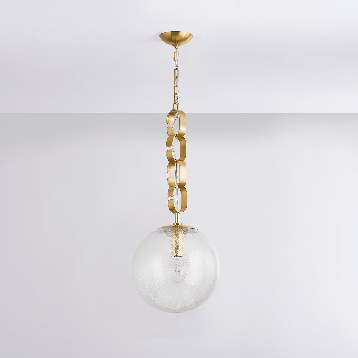 Drawing inspiration from the opulence of the 1930s, this fixture is comprised of seeded glass orbs suspended by chunky Vintage Brass chains. The uniquely colored and swirled glass, coupled with the vintage-inspired forms creates a stunning fixture with high decorative flair. Nessa glimmers with warmth, whether as a chandelier or a pendant light in two sizes.