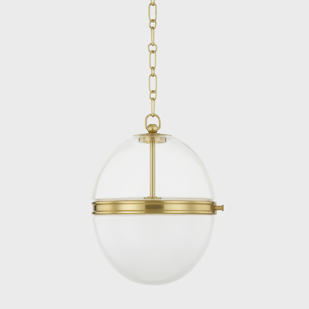 Two different types of glass make this pendant feel special and sophisticated. A detailed Aged Brass or Polished Nickel band at the center separates the clear glass above from the opal glossy glass beneath for a visually interesting design that not only draws the eye when unlit, it beautifully pairs a brighter light with a soft glow when lit. This pretty pendant feels right at home styled over the kitchen island.