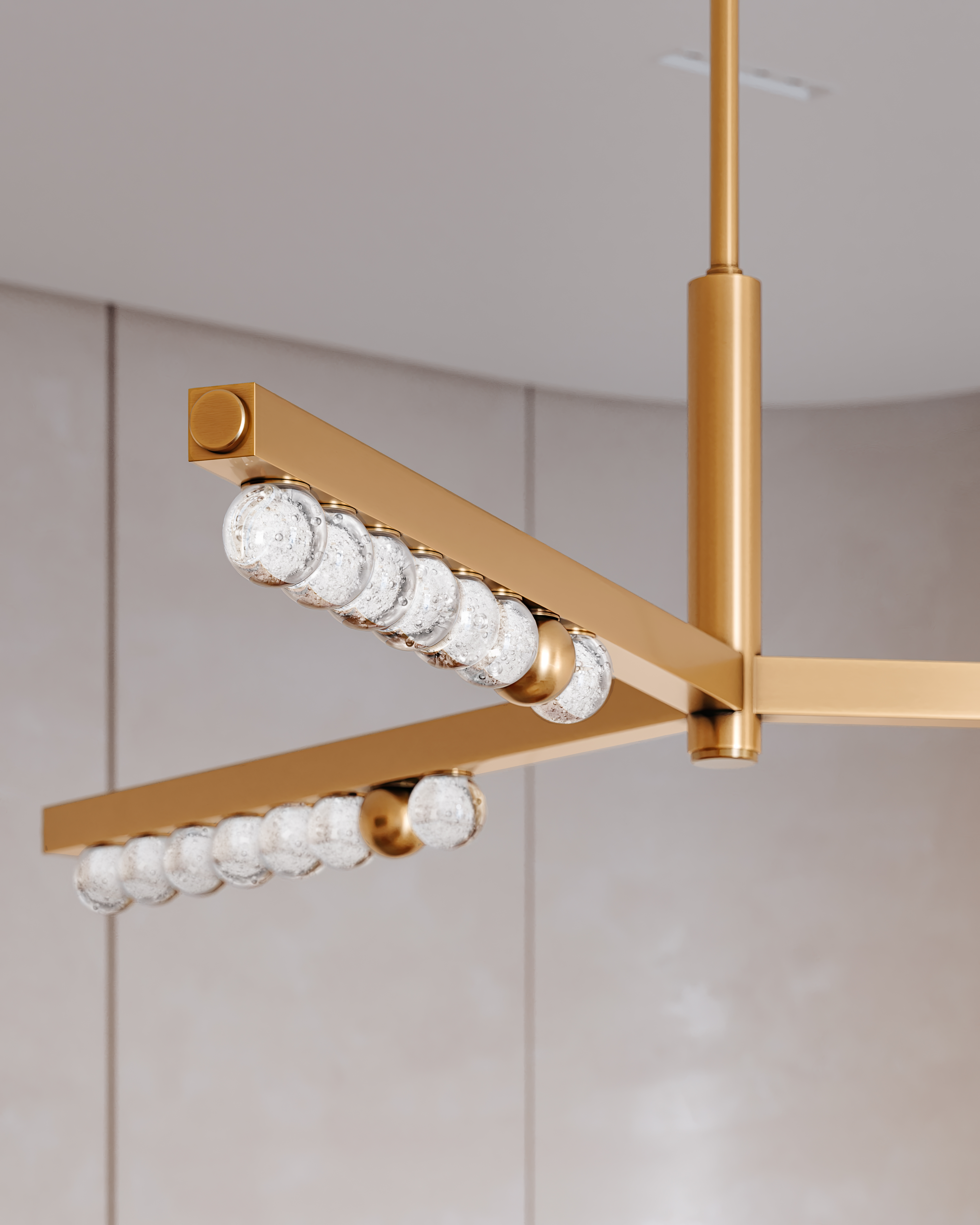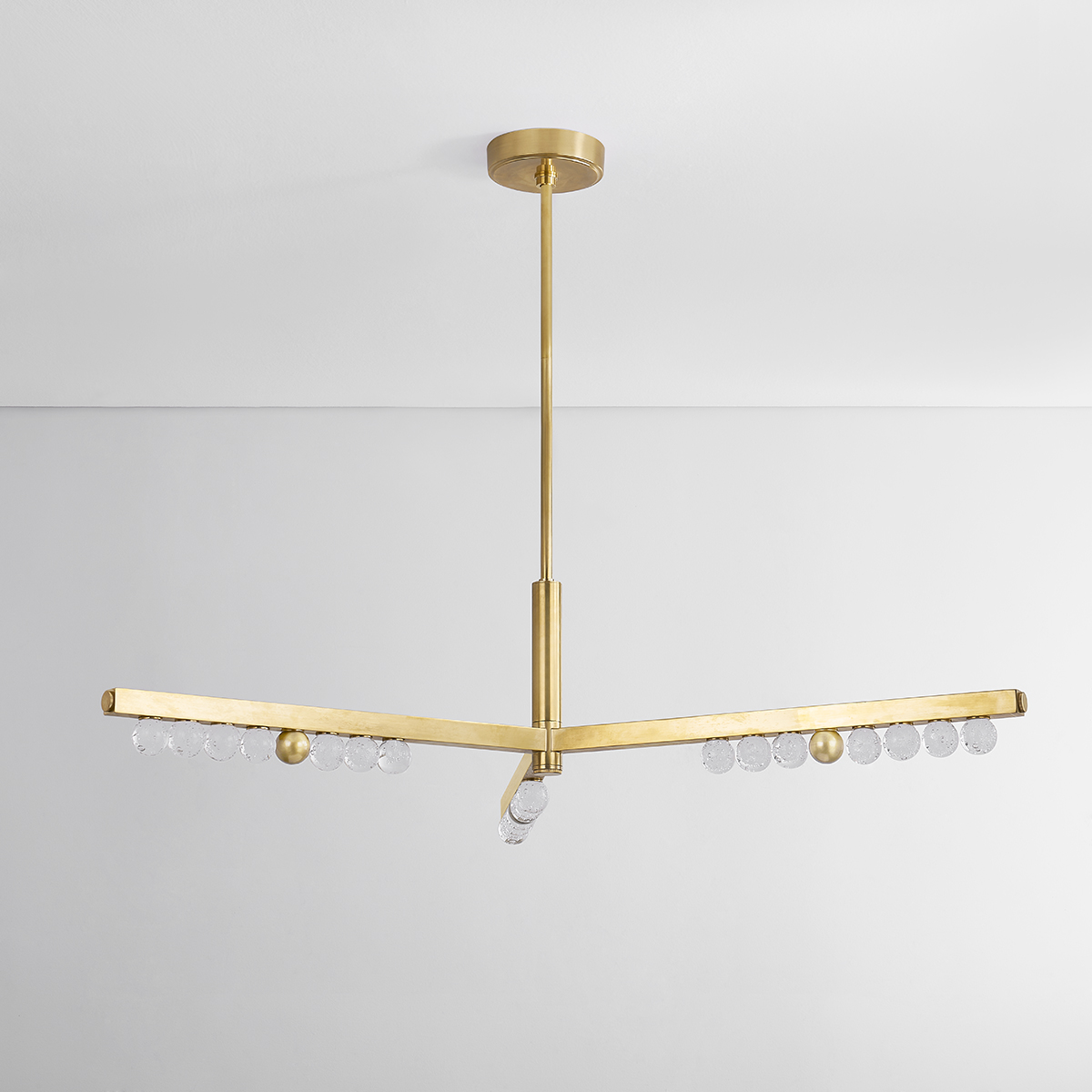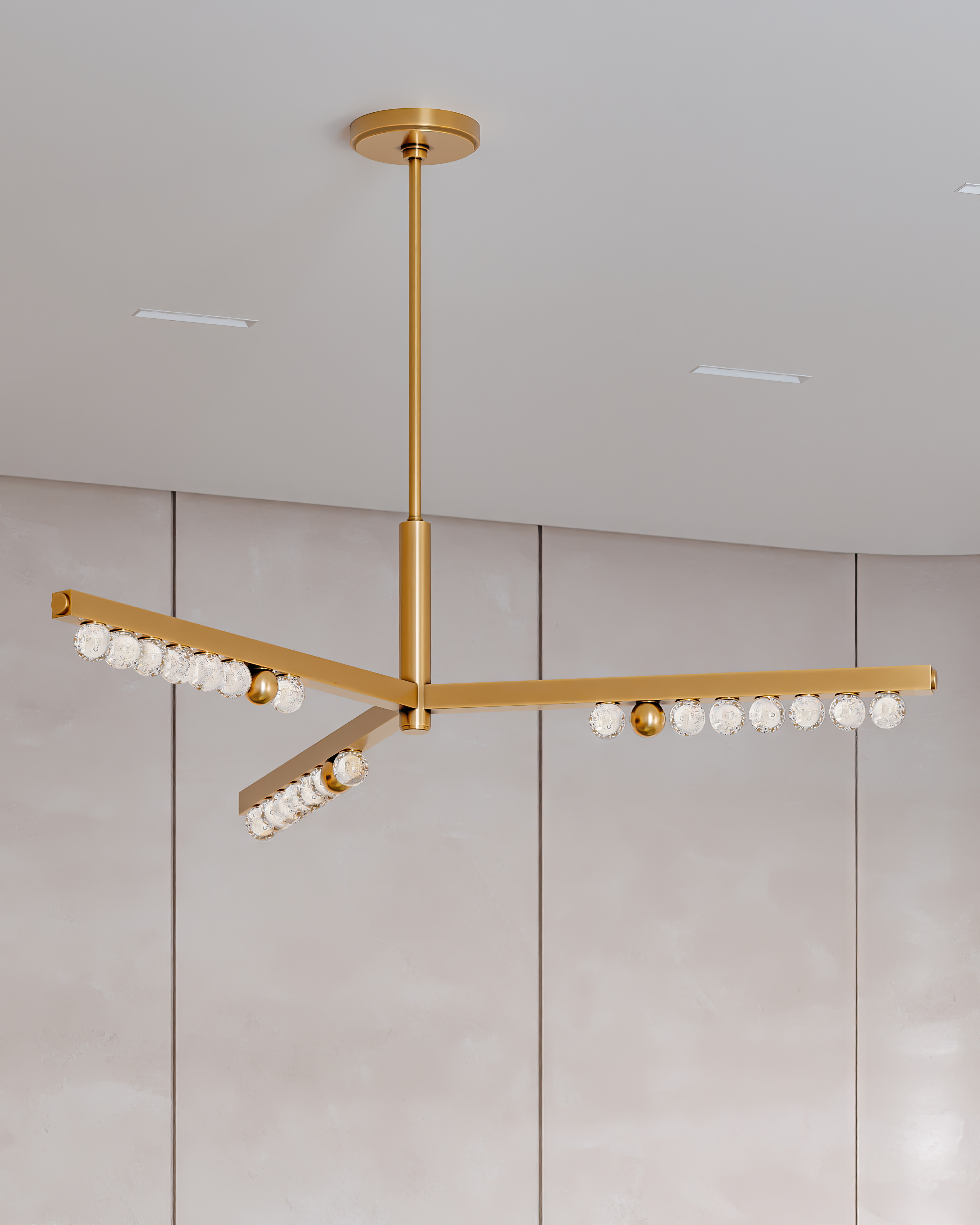 Bright and balanced, the crystal glass orbs of Annecy recall the glamor of an old Hollywood vanity mirror. Lined in a row on a slender Vintage Brass frame, the LED-lit orbs shine brightly over modern interiors. Available as a sconce or chandelier in two sizes, Annecy illuminates a large space with finesse.