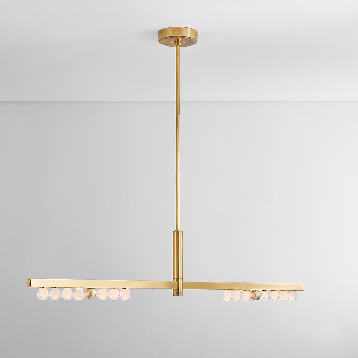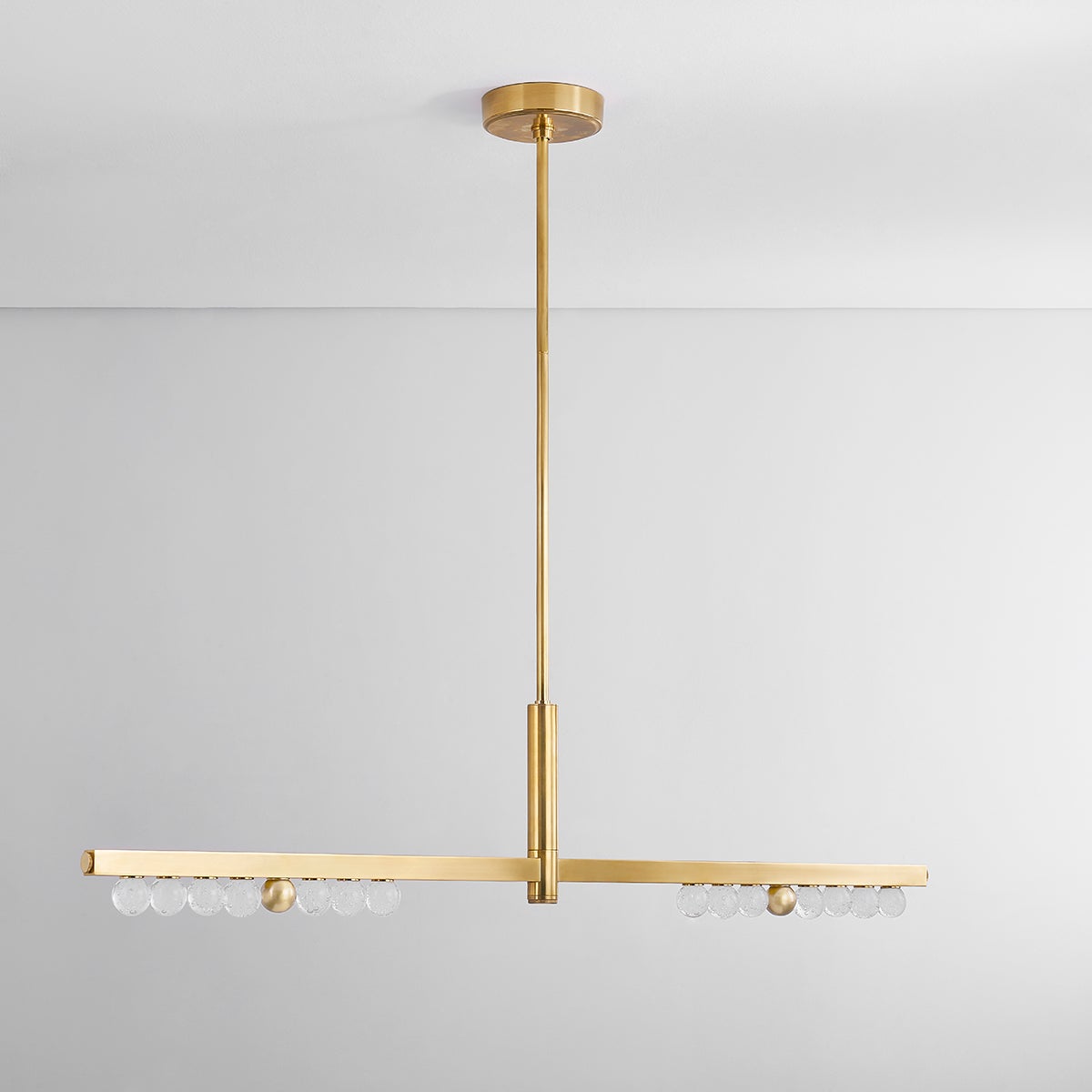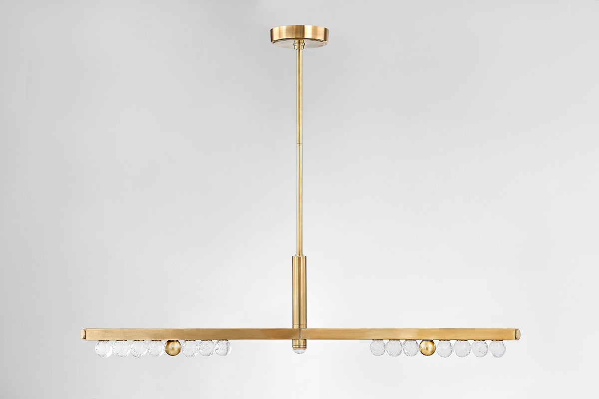 Bright and balanced, the crystal glass orbs of Annecy recall the glamor of an old Hollywood vanity mirror. Lined in a row on a slender Vintage Brass frame, the LED-lit orbs shine brightly over modern interiors. Available as a sconce or chandelier in two sizes, Annecy illuminates a large space with finesse.