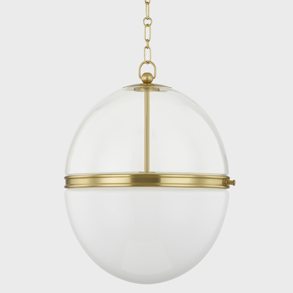 Two different types of glass make this pendant feel special and sophisticated. A detailed Aged Brass or Polished Nickel band at the center separates the clear glass above from the opal glossy glass beneath for a visually interesting design that not only draws the eye when unlit, it beautifully pairs a brighter light with a soft glow when lit. This pretty pendant feels right at home styled over the kitchen island.