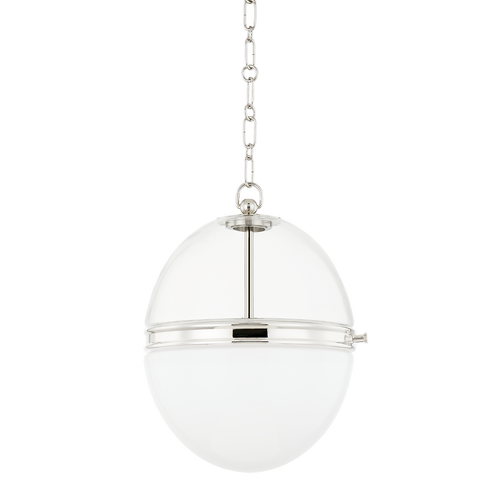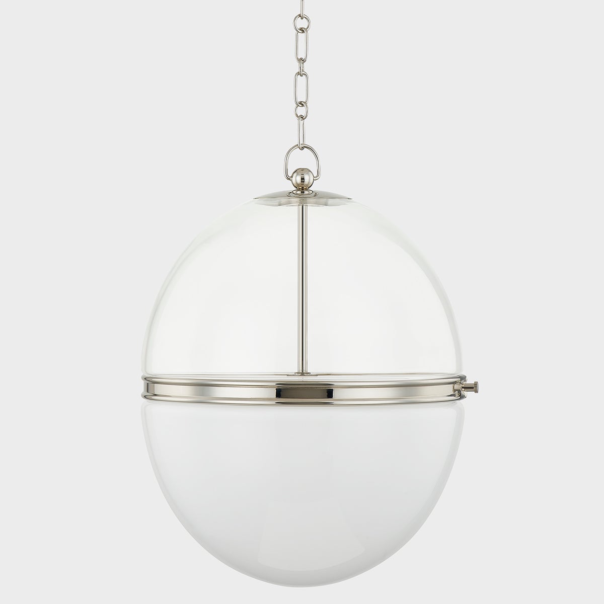 Two different types of glass make this pendant feel special and sophisticated. A detailed Aged Brass or Polished Nickel band at the center separates the clear glass above from the opal glossy glass beneath for a visually interesting design that not only draws the eye when unlit, it beautifully pairs a brighter light with a soft glow when lit. This pretty pendant feels right at home styled over the kitchen island.