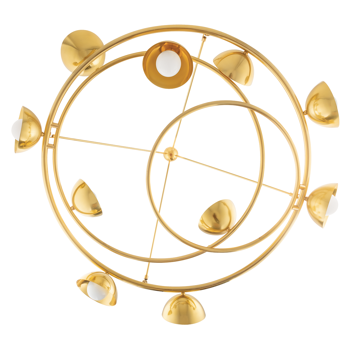 A framework of intersecting circles gives Oraibi an orbit-like feel. The bowl-shaped shades fill with light from the opal glossy glass globes and softly reflect off the Vintage Brass.