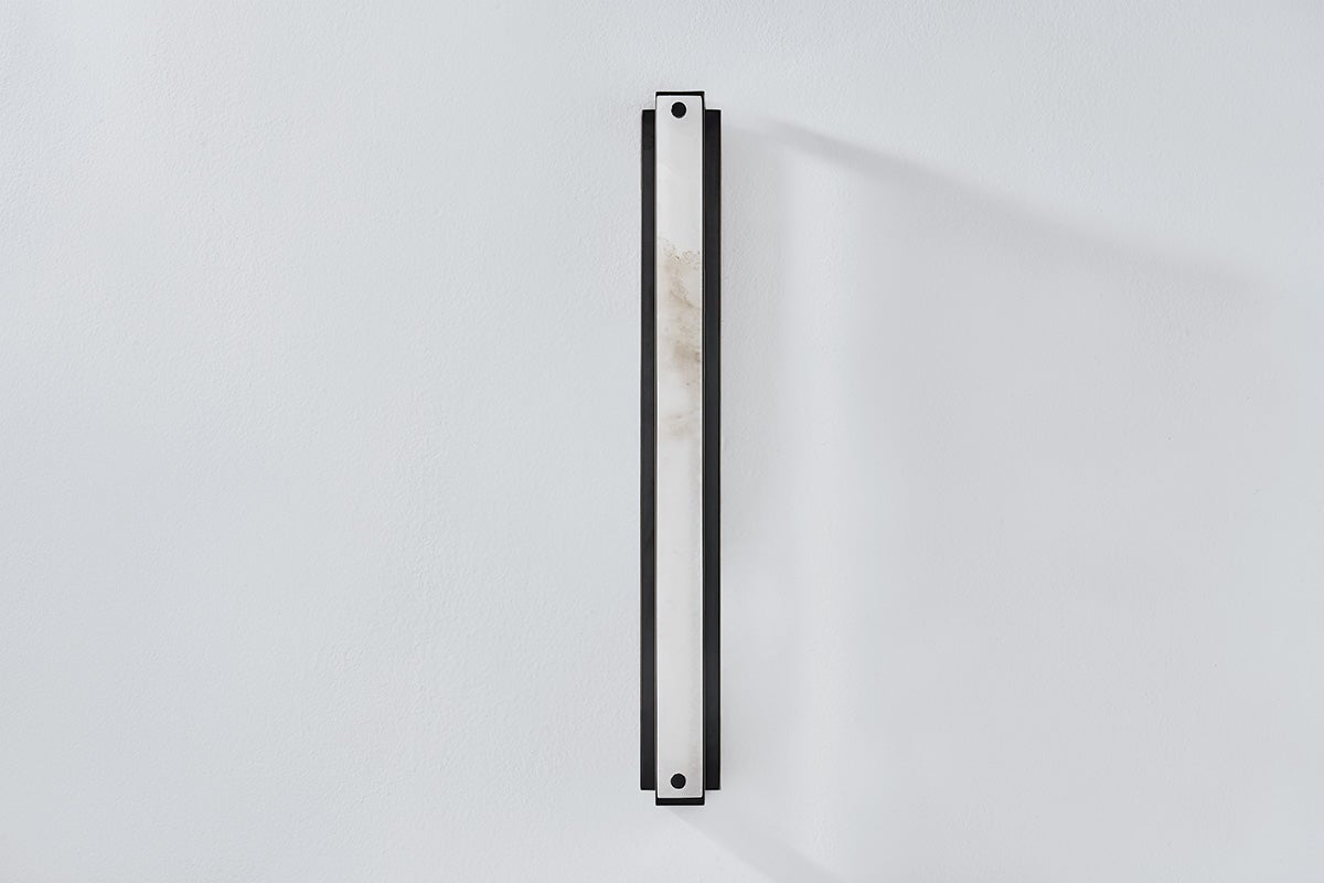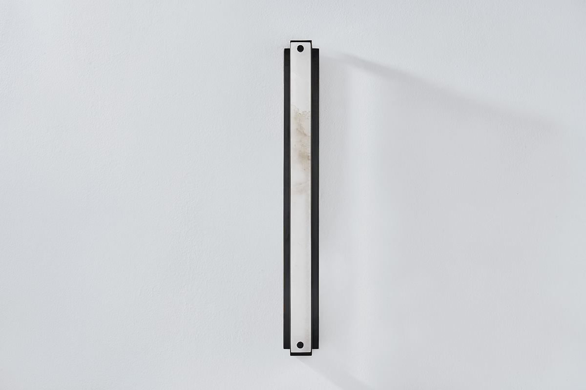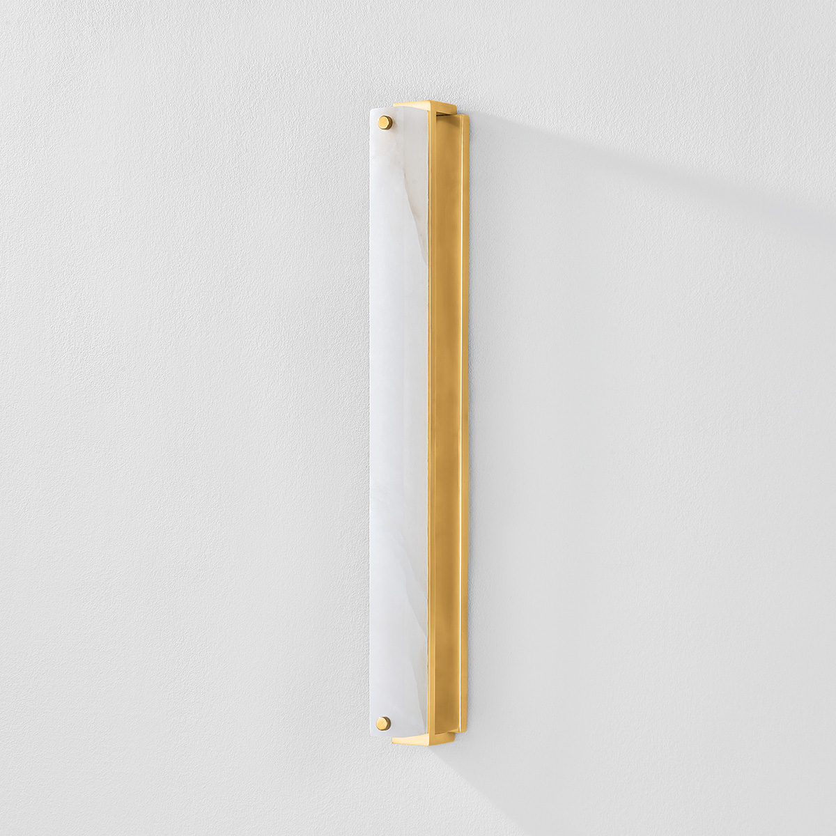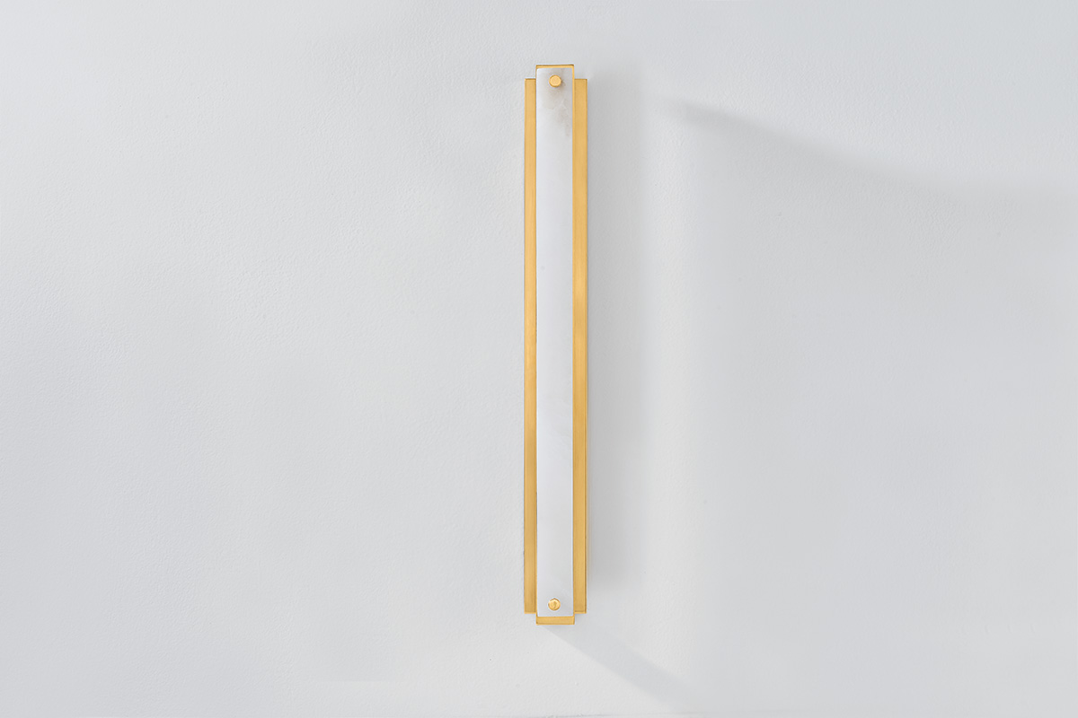 A modern ‘air lantern’ design with a bold architectural silhouette. In lieu of a central light source, LED strips are integrated into the cage of Edgemere itself. A rectangular panel of alabaster is attached to each arm, creating a geometric array of light within the piece. The sleek mixed materiality feels grand and traditional with a futuristic edge. Available in a 3 or 4-light pendant in Aged Brass or Aged Brass and Distressed Bronze or a single light sconce in Aged Brass or Distressed Bronze.