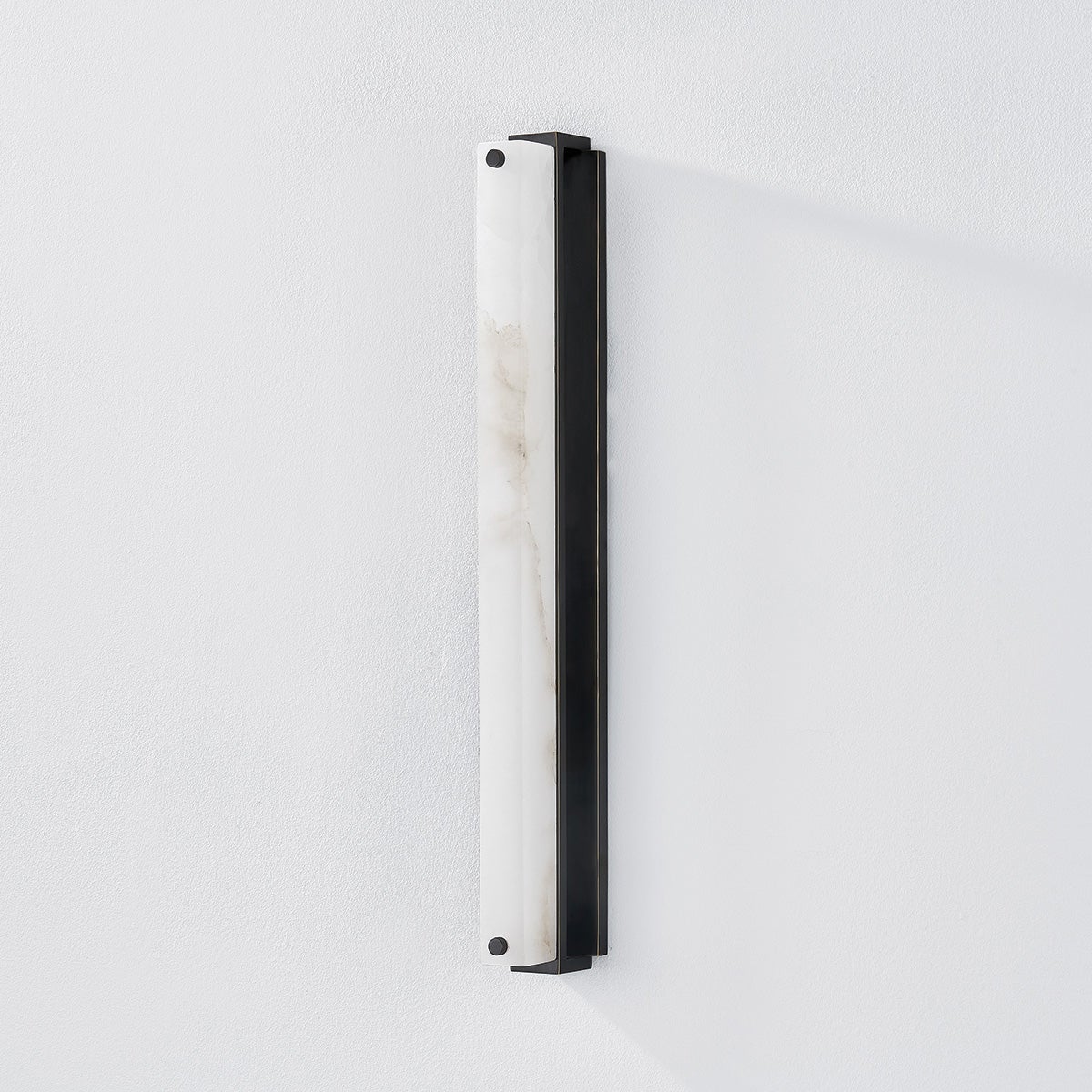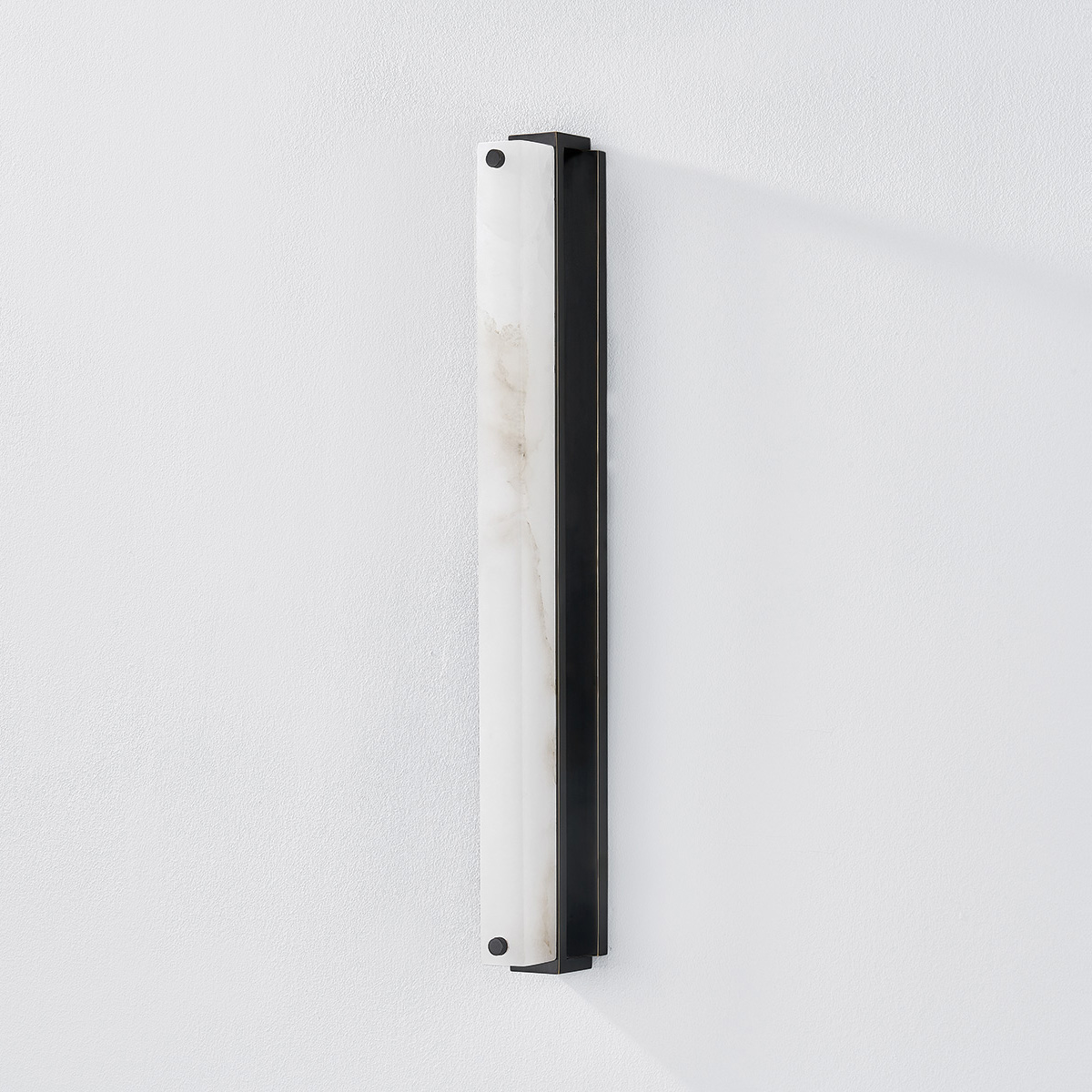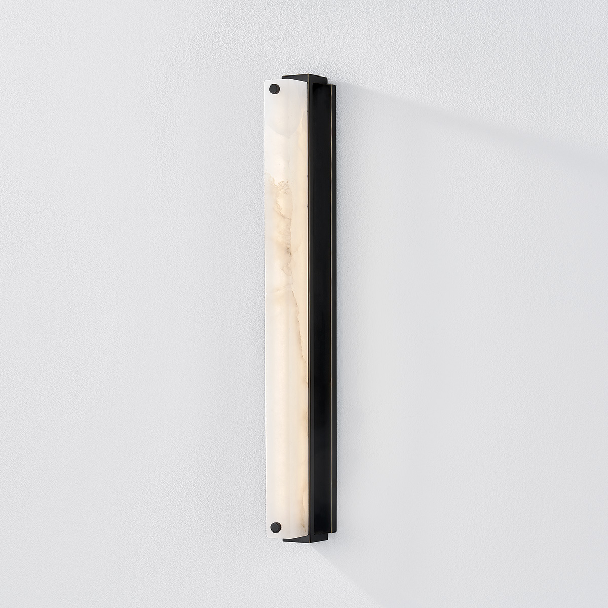 A modern ‘air lantern’ design with a bold architectural silhouette. In lieu of a central light source, LED strips are integrated into the cage of Edgemere itself. A rectangular panel of alabaster is attached to each arm, creating a geometric array of light within the piece. The sleek mixed materiality feels grand and traditional with a futuristic edge. Available in a 3 or 4-light pendant in Aged Brass or Aged Brass and Distressed Bronze or a single light sconce in Aged Brass or Distressed Bronze.