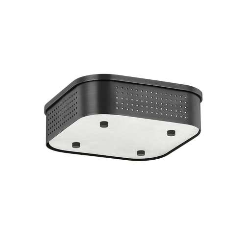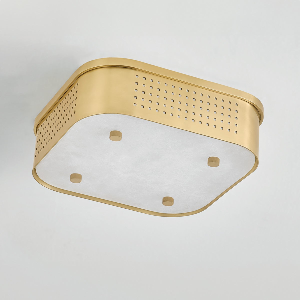 Bringing two striking materials together, Madison Square features a thick panel of alabaster recessed into a sleek metal shade. Perforations in the shade add a graphic edge to this flush mount while facilitating side illumination. When the LED is illuminated, the milky alabaster comes alive with a warm, welcoming glow. Choose between two distinctive finish options: Aged Brass for a timeless elegance or Distressed Bronze for a more industrial feel.