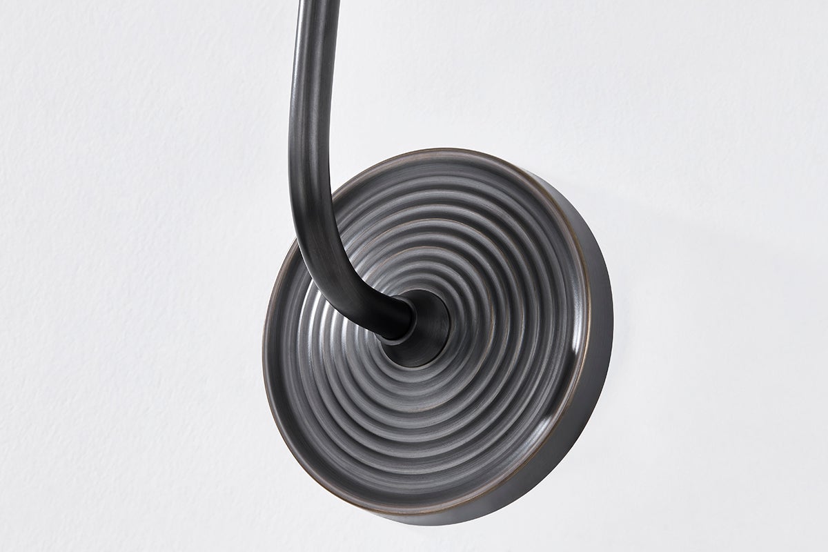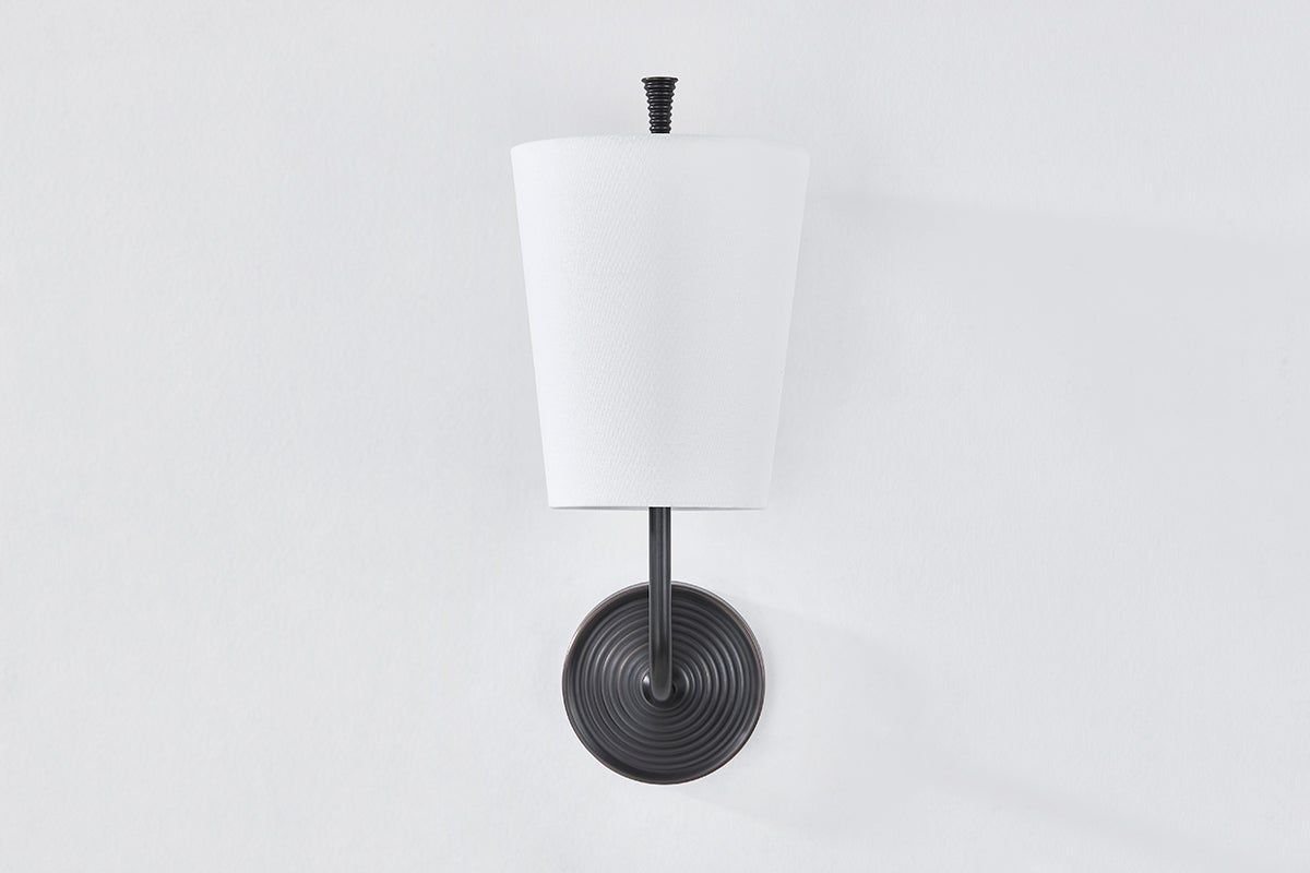 The Gladstone sconce is a timeless tribute to playful shapes and contemporary geometries. Featuring a tapered white linen shade with a large opening at the top, it creates a powerful uplight, brightening up dark ceilings to make a room feel more spacious. The distinctive swirled backplate and matching finial add contemporary whimsy. Available in two finishes; Aged Brass and Distressed Bronze.