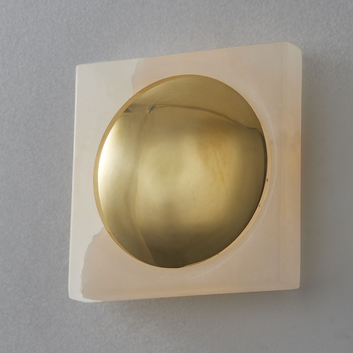 Mixing materials and playing with shapes, Hamel places a metal disc shade in front of a natural stone backplate. An LED behind the shade backlights the Vintage Brass or Burnished Nickel finish and flows through to illuminate the alabaster with a soft glow. Available as a sconce or a flush mount in two different sizes.
