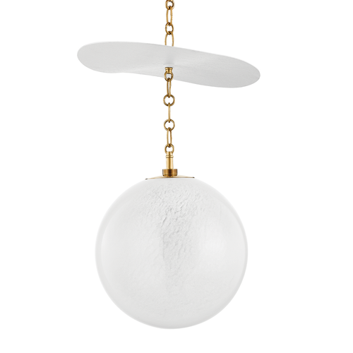 Inspired by dangle earrings, Antoinette is jewelry for the wall or ceiling. Cloud glass globes with Vintage Brass shade caps hang from an intricate chain in a matching metal finish. The Gesso White disc adds visual interest and picks up the light from the globes below.