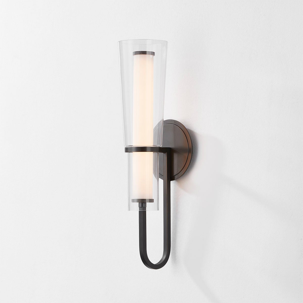 Embodying understated elegance, this versatile sconce features a hurricane lamp made from clear glass supported by an Aged Brass or Old Bronze frame. Within the shade is an energy-efficient LED encased in an opal glossy glass tube, diffusing light evenly throughout small spaces.