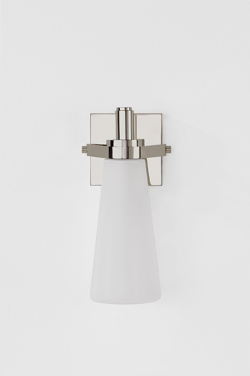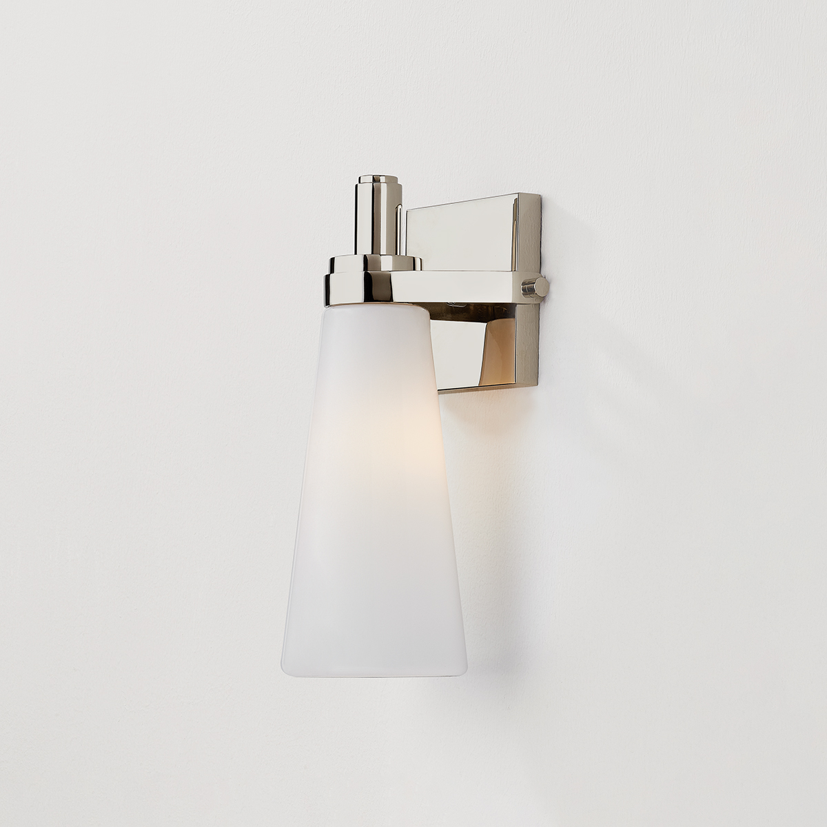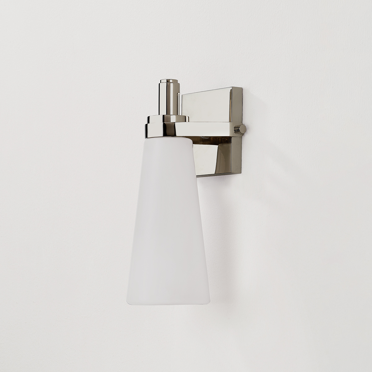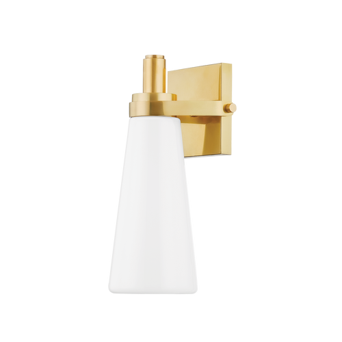 Form meets function in this simple yet refined sconce. The conical opal glossy glass shade of Trude tapers into a wider opening at the bottom, creating a powerful downlight. Rather than a traditional arm back, the upscale mechanical metalwork nods to mid-century modern design aesthetics. The frame is available in Aged Brass or Polished Nickel for a more classic or contemporary finish.