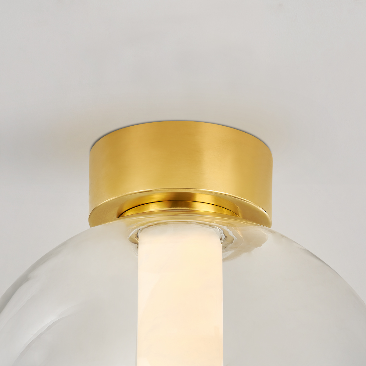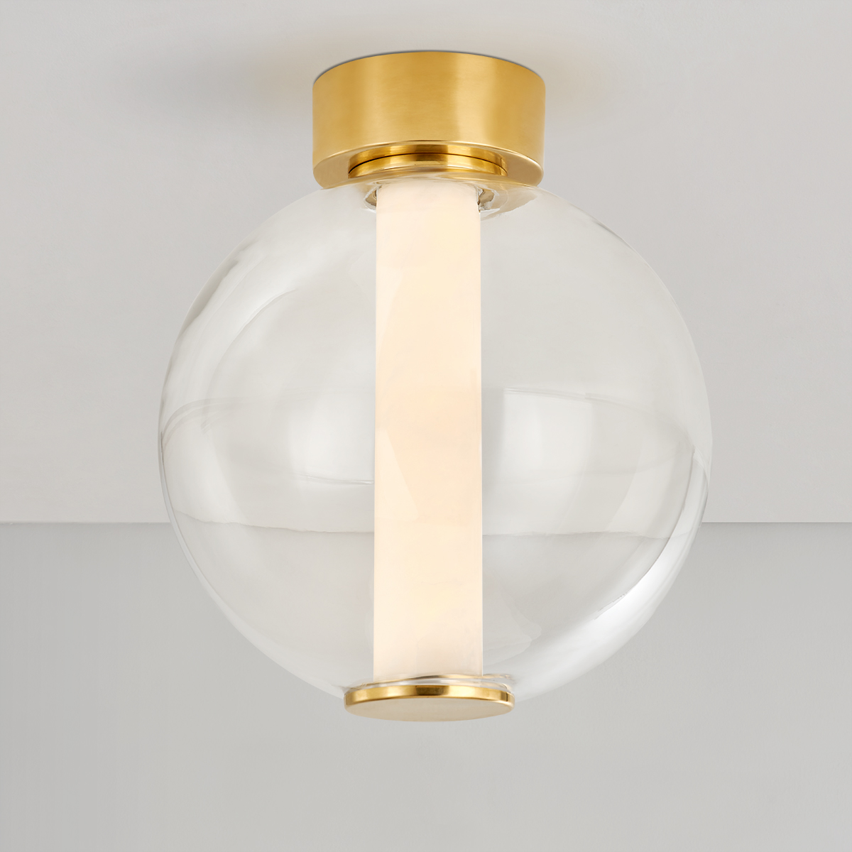 An alabaster tube is captured inside a clear glass globe creating interest when unlit and a stunning display when lit. With its simple silhouette, unique elements and mix of luxurious materials, Pietra can stand on its own or hang in multiples. Available as a pendant in 3 sizes or as a refreshingly different flush mount.