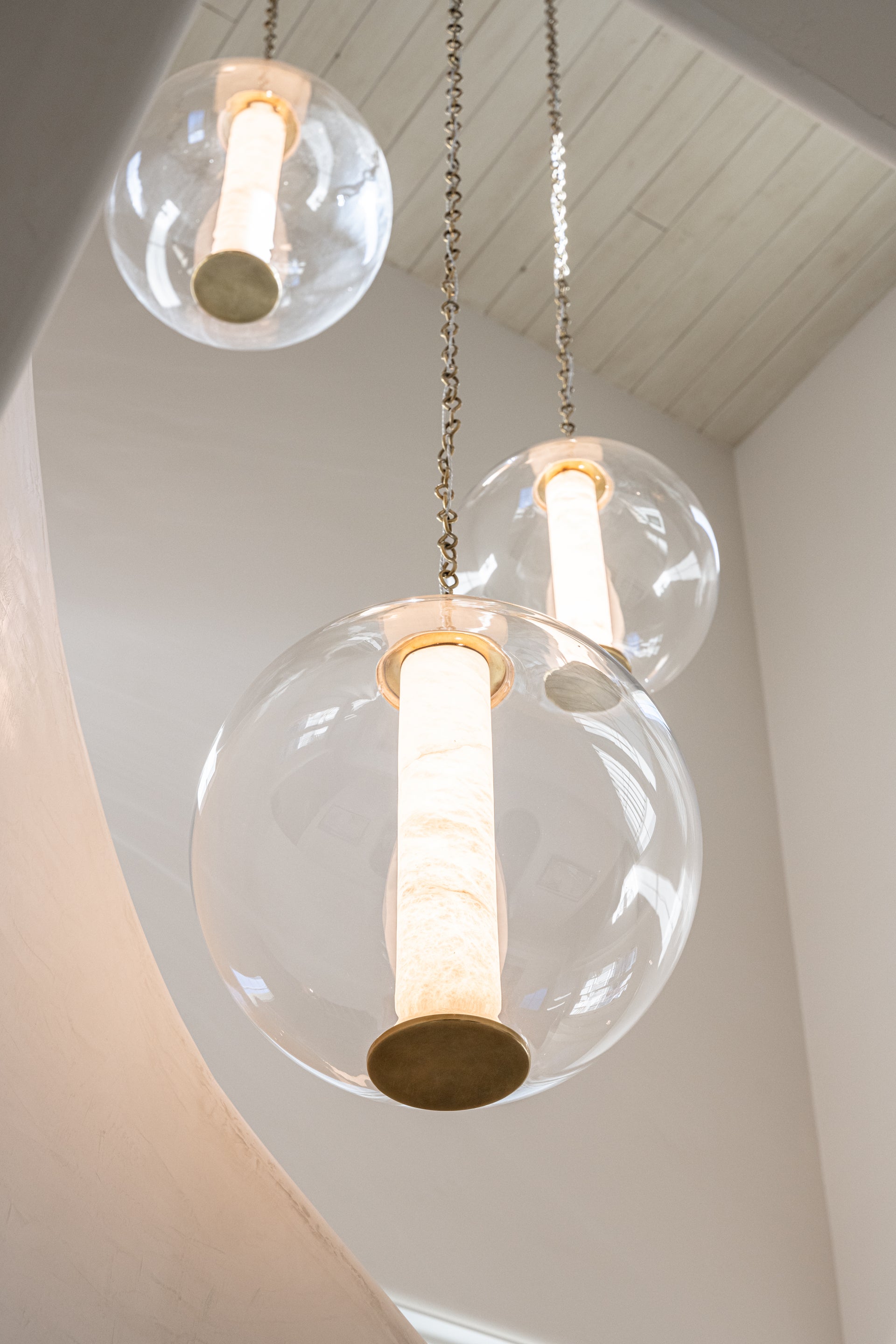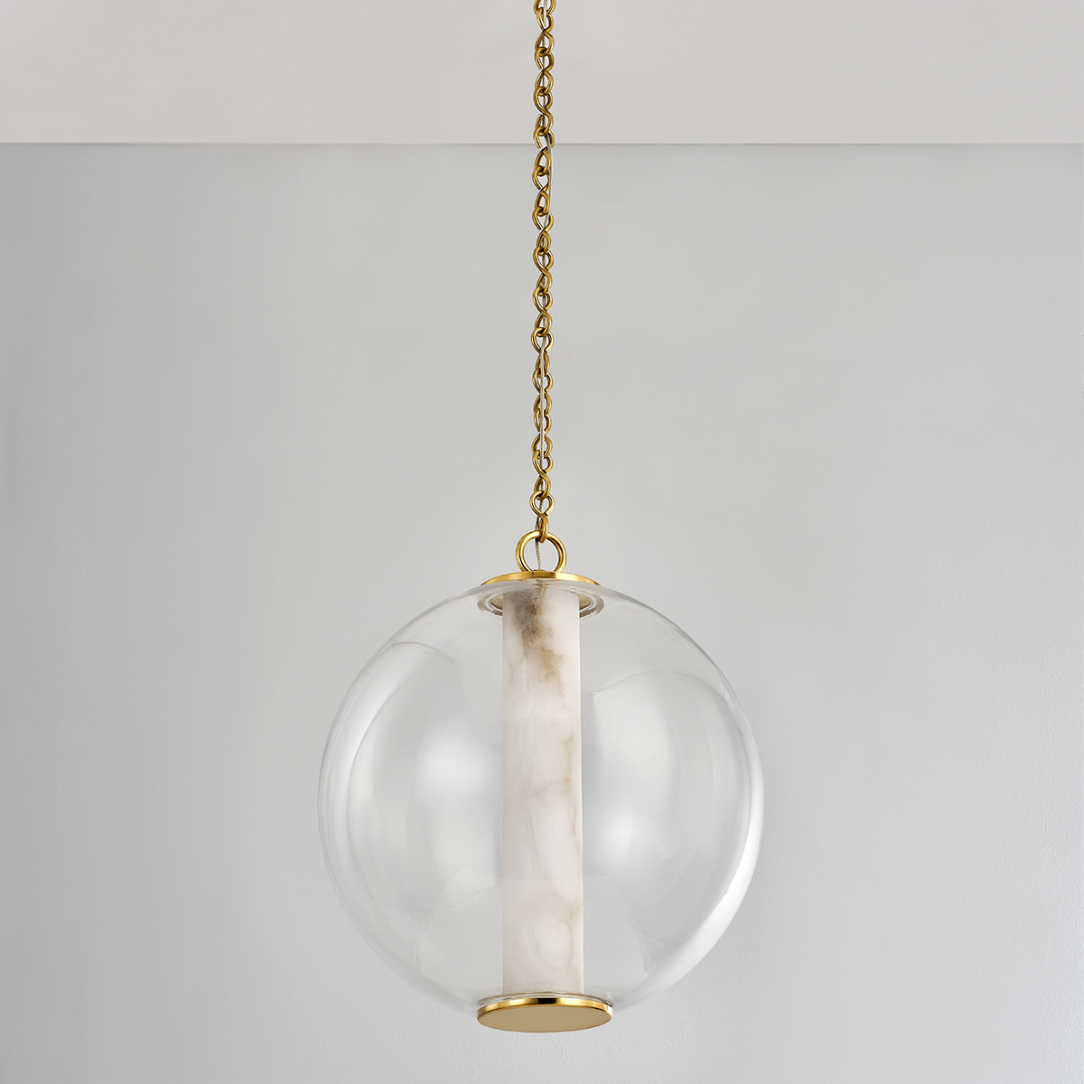 An alabaster tube is captured inside a clear glass globe creating interest when unlit and a stunning display when lit. With its simple silhouette, unique elements and mix of luxurious materials, Pietra can stand on its own or hang in multiples. Available as a pendant in 3 sizes or as a refreshingly different flush mount.