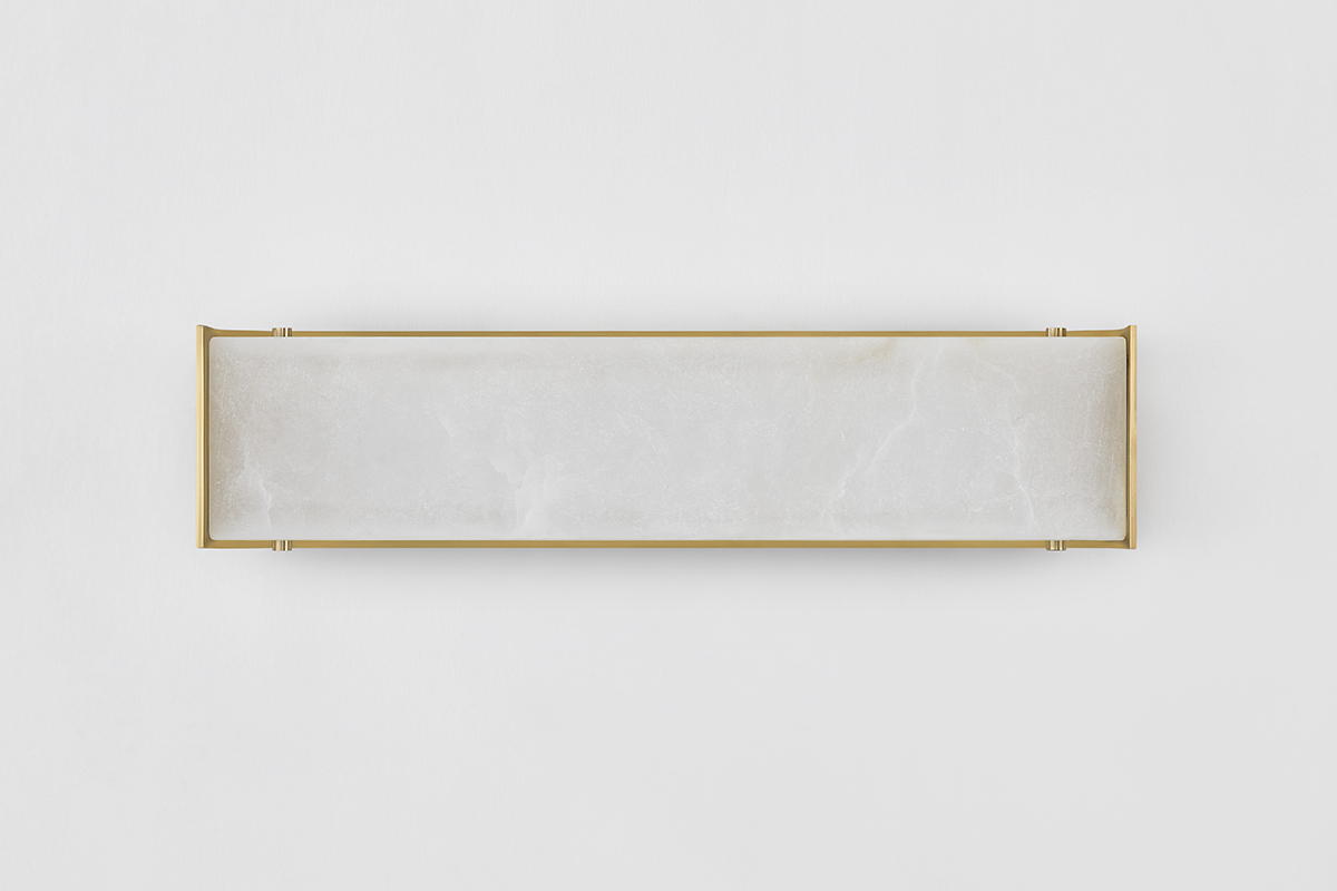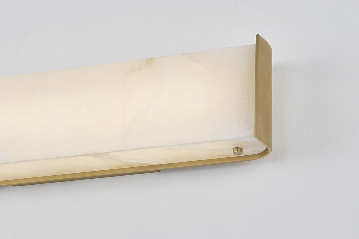 Inspired by the grandeur of Greek architecture, this statuesque wall sconce features a thick alabaster stone slab ensconced within a Vintage Brass frame. With its natural veining and translucency, the ivory alabaster reveals its color and texture when lit. Available in two sizes, Hera presents a striking visual display in a hallway or bathroom.