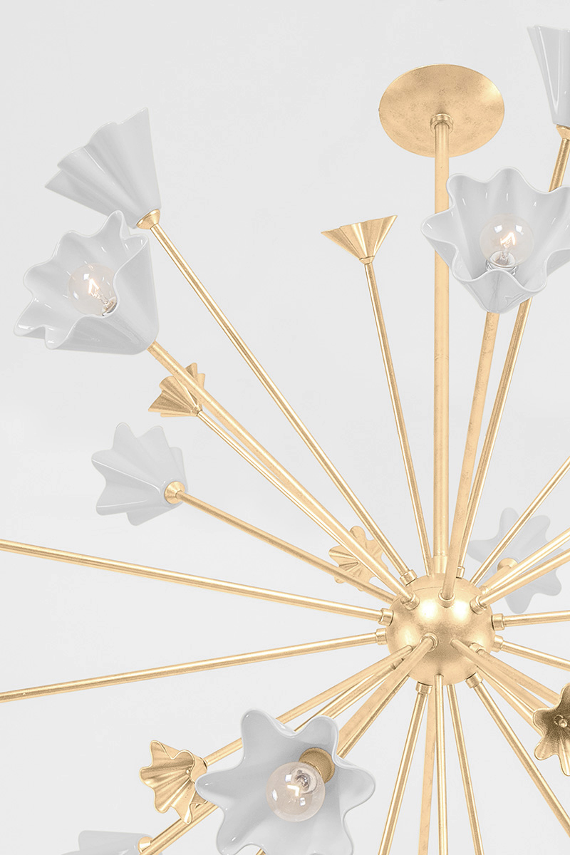 Julieta combines natural forms with bold designs to create an organic feel that makes a big statement. A beautiful glow fills the White Porcelain flower-shaped shades that sit atop Vintage Gold Leaf arms. The chandelier is a minimalist take on the sputnik form and the wall sconce makes its presence known with its long, striking arm.