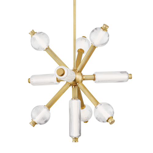 A nature-inspired spin on an iconic mid-century sputnik design, Atom brings a burst of illumination to modern interiors. This dynamic composition features glass spheres and cylinders that are brilliantly lit by energy-efficient LEDs. The reeded detailing of the arms is accented by smooth metalwork in a Vintage Brass finish. Atom is available as a 2-light wall sconce and 10 or 13-light chandeliers.