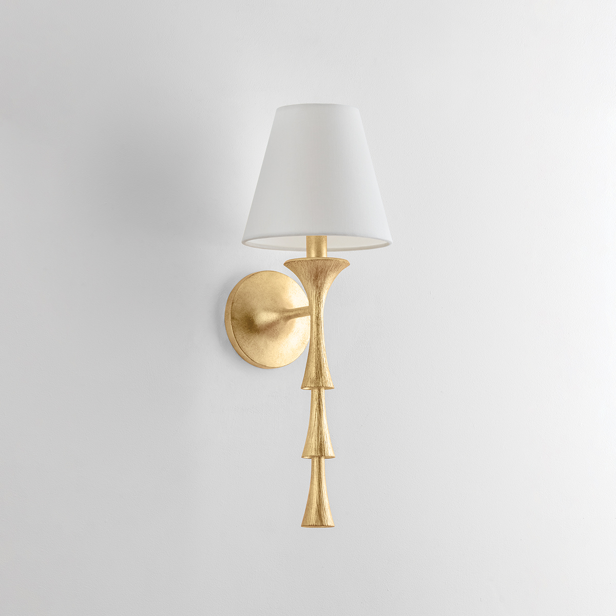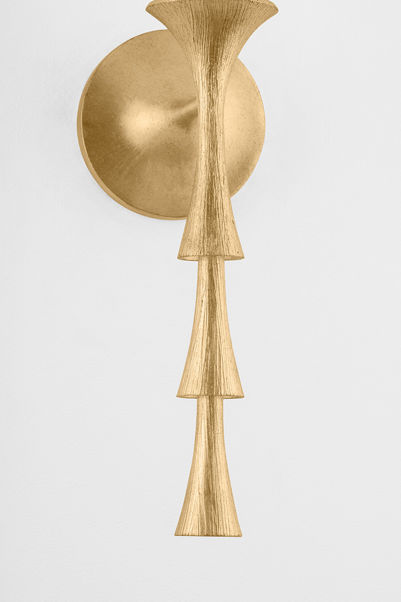Nature meets geometry in the elevated Vails Gate. This pendant features a repetitious stack of flared trumpet forms, reminiscent of the nodes on a flower stem. Fluting details add depth to the symmetrical design, nodding to its organic origins. Finished in Vintage Gold Leaf, Vails Gate is available as a pendant light in two sizes and a 1-light sconce.