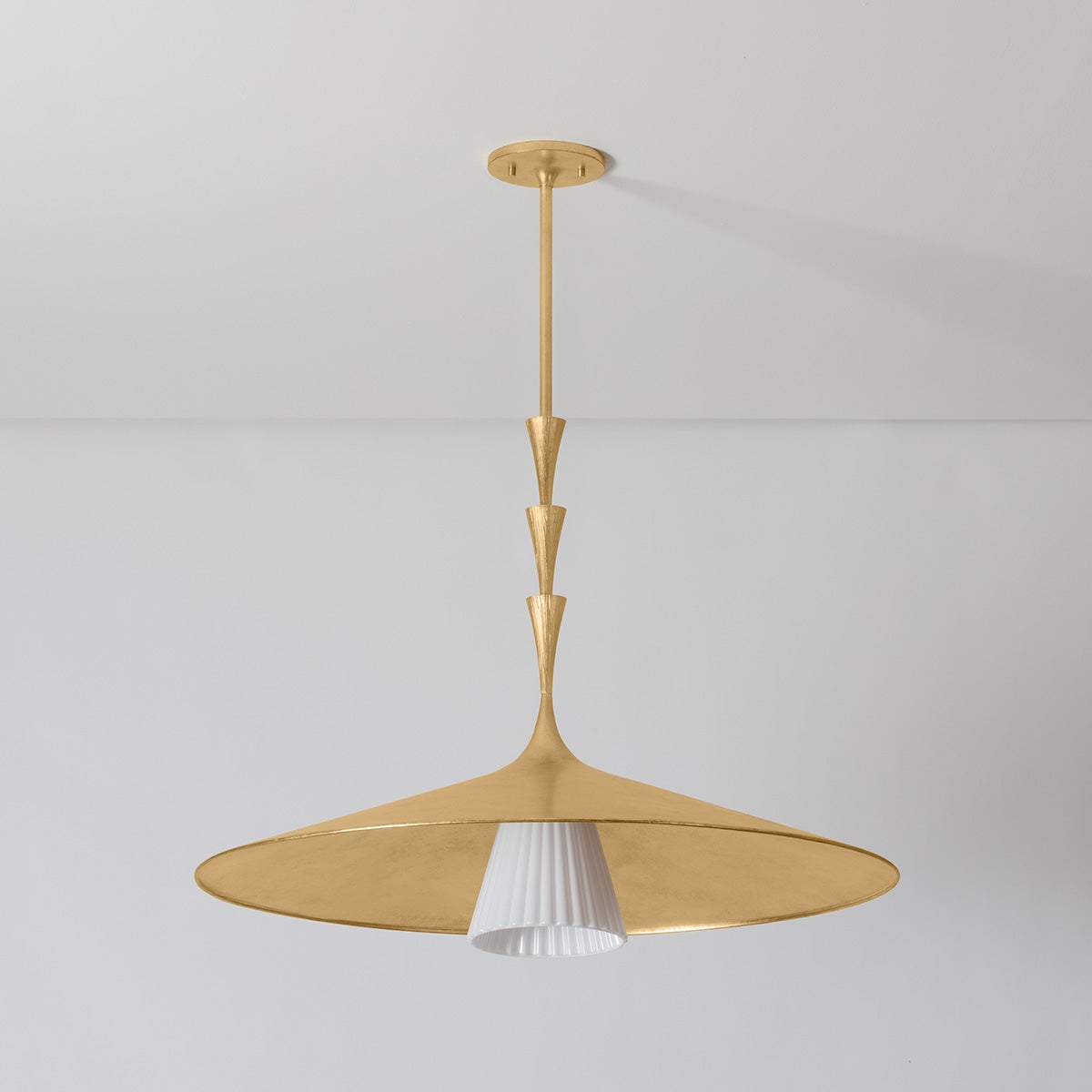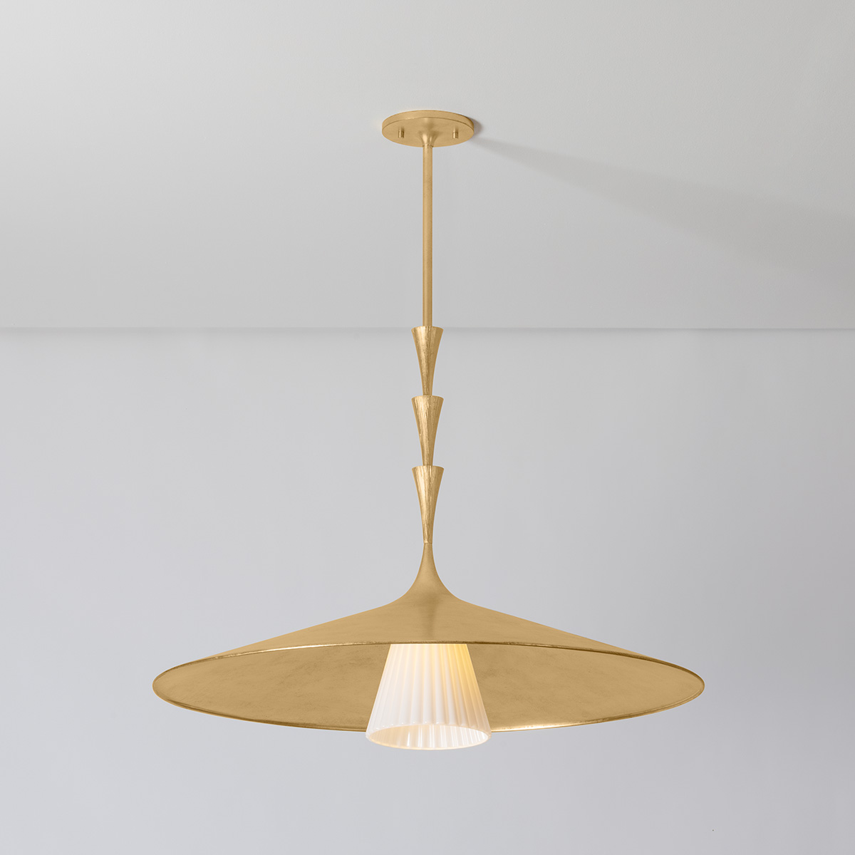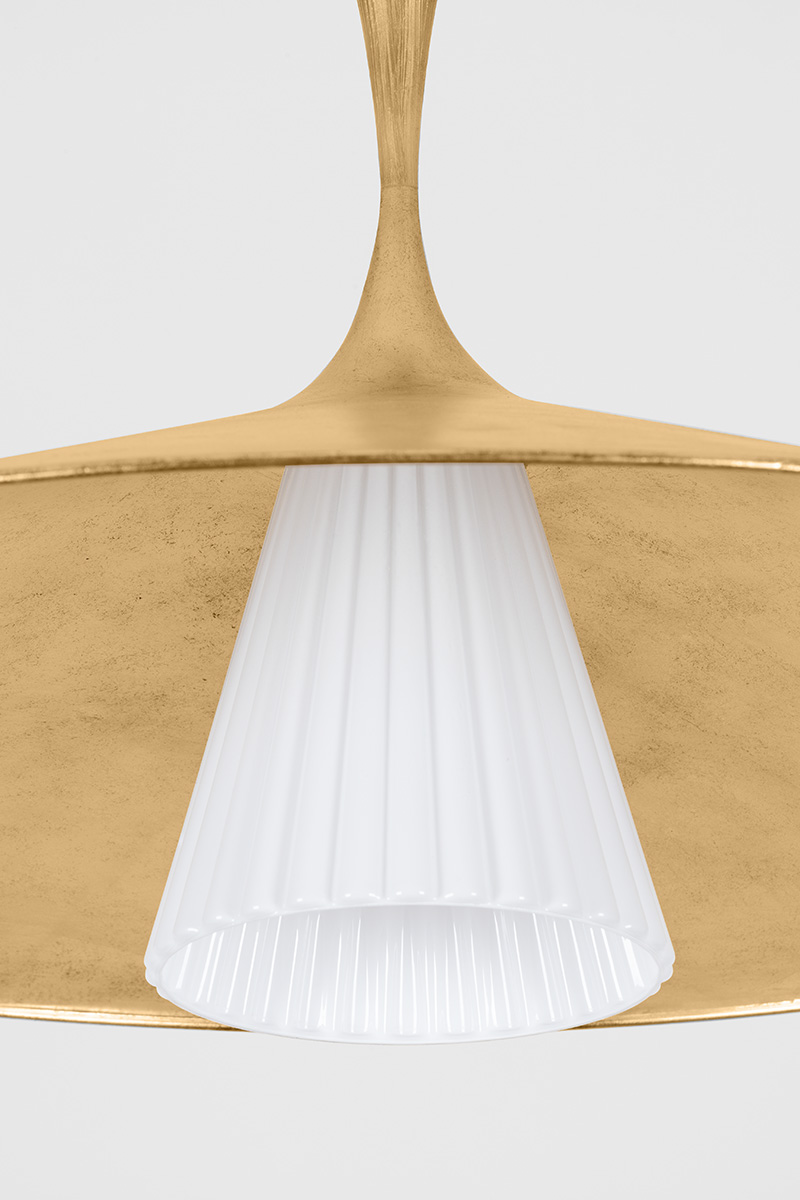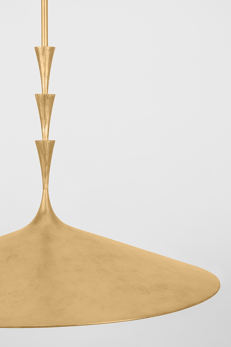Nature meets geometry in the elevated Vails Gate. This pendant features a repetitious stack of flared trumpet forms, reminiscent of the nodes on a flower stem. Fluting details add depth to the symmetrical design, nodding to its organic origins. Finished in Vintage Gold Leaf, Vails Gate is available as a pendant light in two sizes and a 1-light sconce.