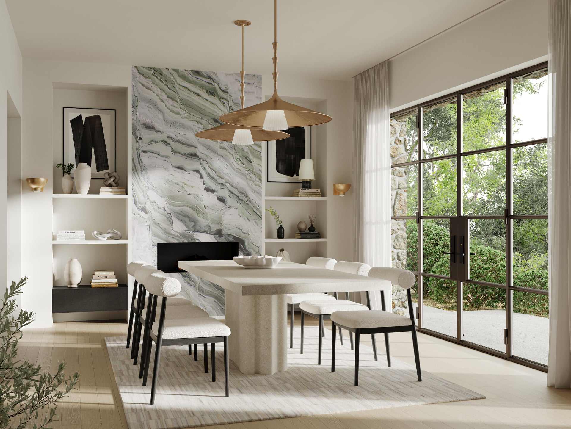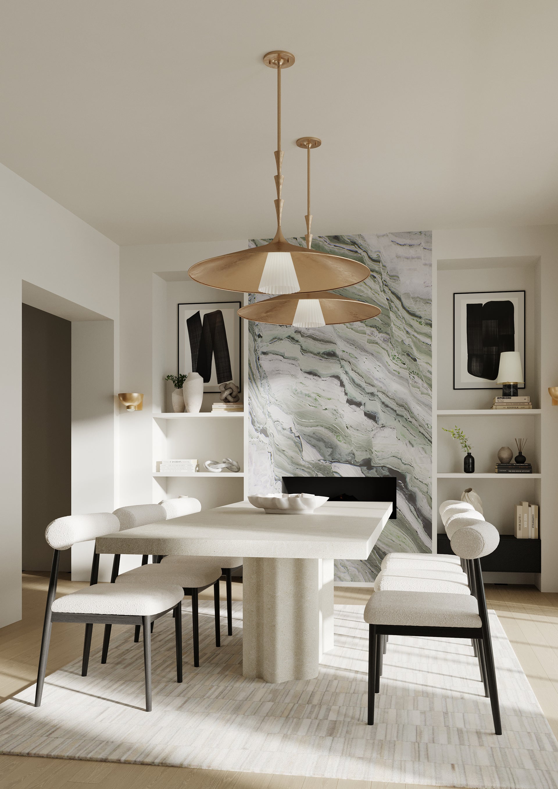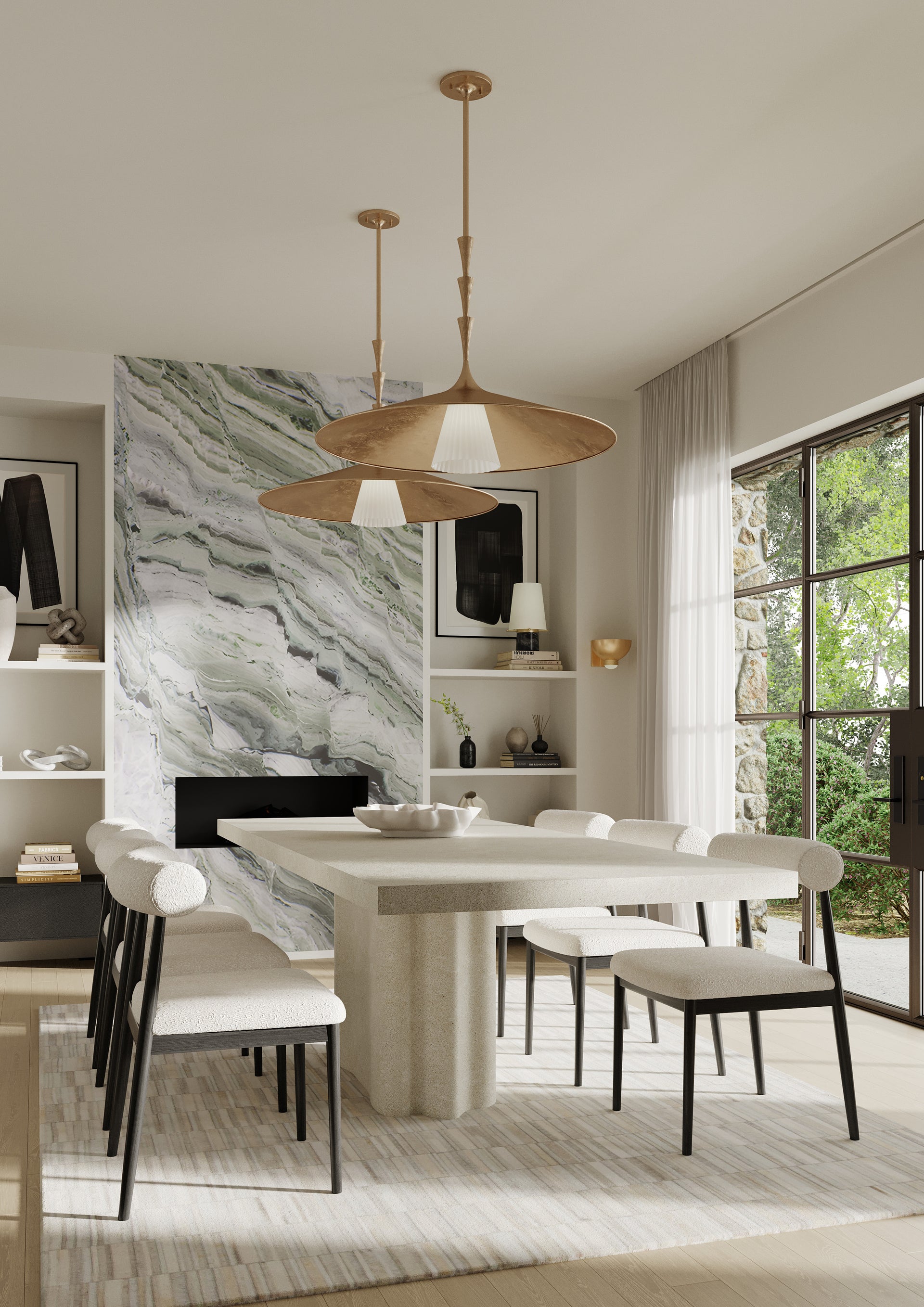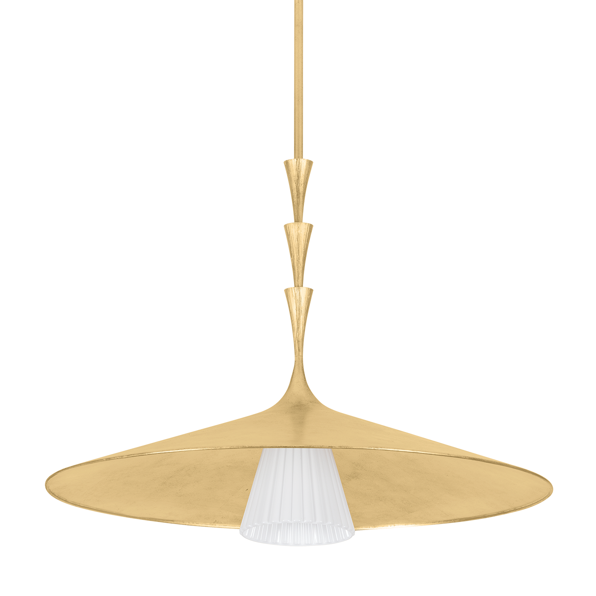 Nature meets geometry in the elevated Vails Gate. This pendant features a repetitious stack of flared trumpet forms, reminiscent of the nodes on a flower stem. Fluting details add depth to the symmetrical design, nodding to its organic origins. Finished in Vintage Gold Leaf, Vails Gate is available as a pendant light in two sizes and a 1-light sconce.