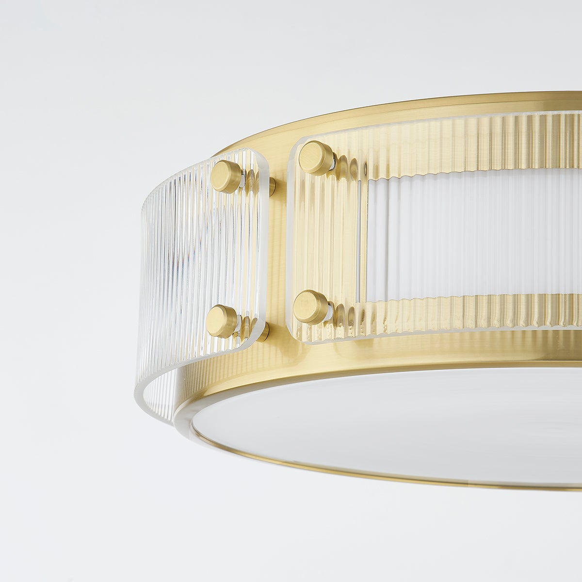 Rectangular panels are cut from Aged Brass or Polished Nickel metalwork and topped by a curved ribbed glass, making this traditional flush mount design feel updated and fresh. Light not only flows through the opal glossy glass lens at the bottom but seeps through the pockets on the sides and plays off the ribbed panels. Exposed hardware details complete the clean, modern aesthetic.