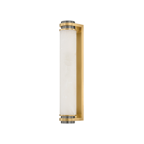 A celebration of the beauty of natural alabaster, this minimalist tube sconce is a timeless staple for the modern home. An elongated backplate frames the alabaster shade with a slim touch of metal. The Vintage and Patina Brass finishes forge a geometric relationship with the softness of the natural veining of the stone. Available in two sizes, Sorrento has bath and powder room crossover appeal.