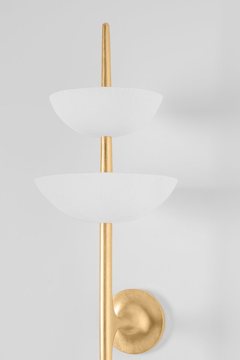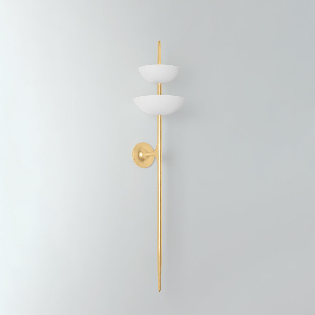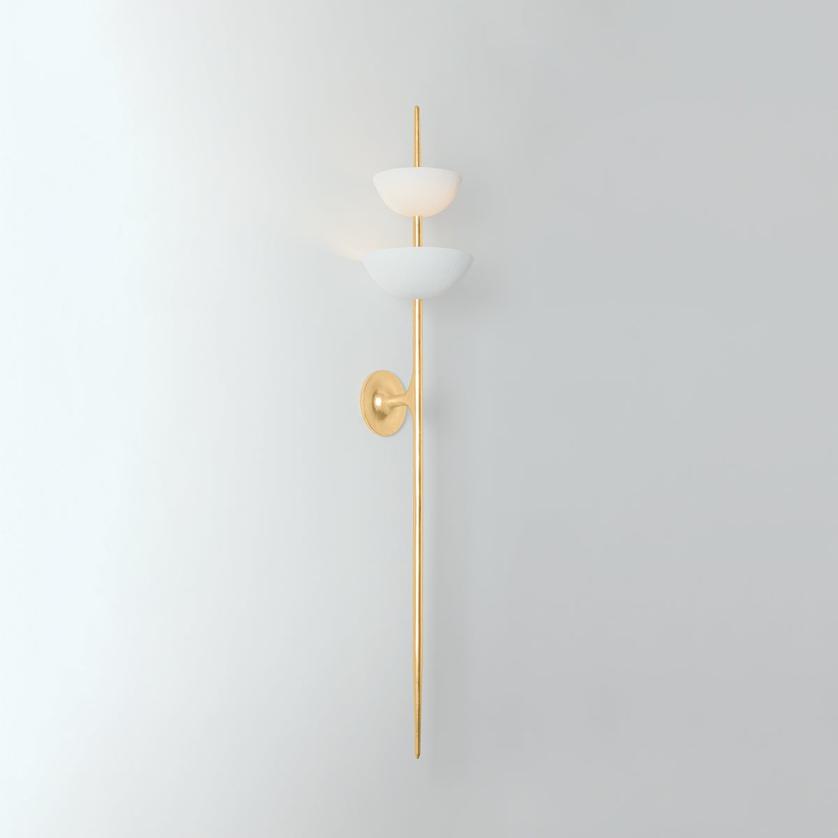 Combining straight lines and curved forms, Evander is all about balance. The stacked, gesso white bowls are filled with light, reflecting upon each other to create a tranquil glow. Organic shaping in the connection points softens the overall impression of the slender framework. Evander is available as a 6 or 10-light chandelier and a 2-light wall sconce.