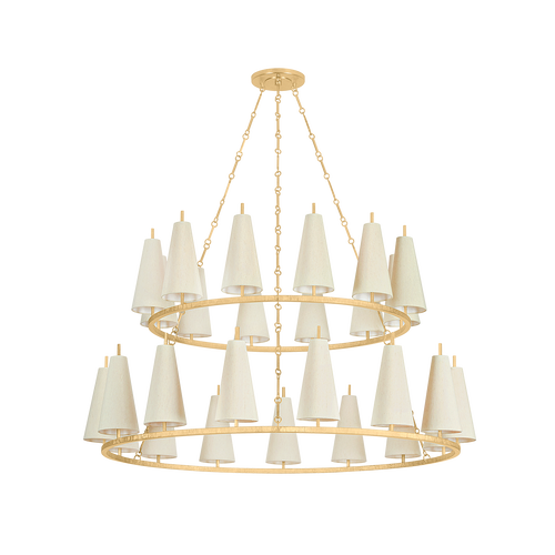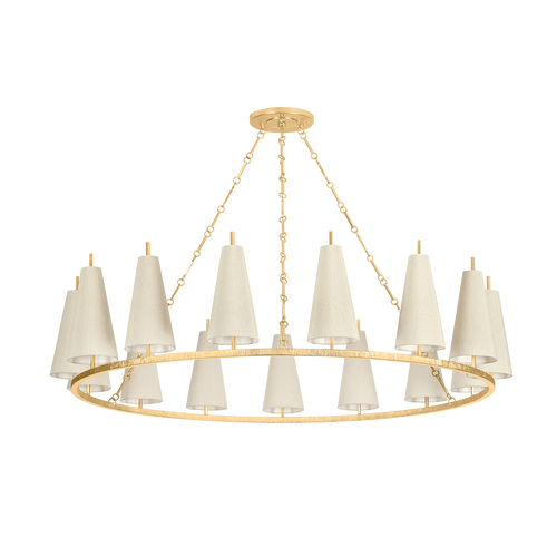 While simplistic, the natural silk shades and circular motifs of the Tirana family nod to a nautical spirit. The conical shades provide a contemporary lightness to the traditional silhouettes. By contrast, the delicately textured Vintage Gold Leaf metalwork catches the light like a modish bangle bracelet. Available as a 1-light sconce and a 12-light, 15-light, and 27-light chandelier, Tirana produces warm, refined lighting for transitional spaces.