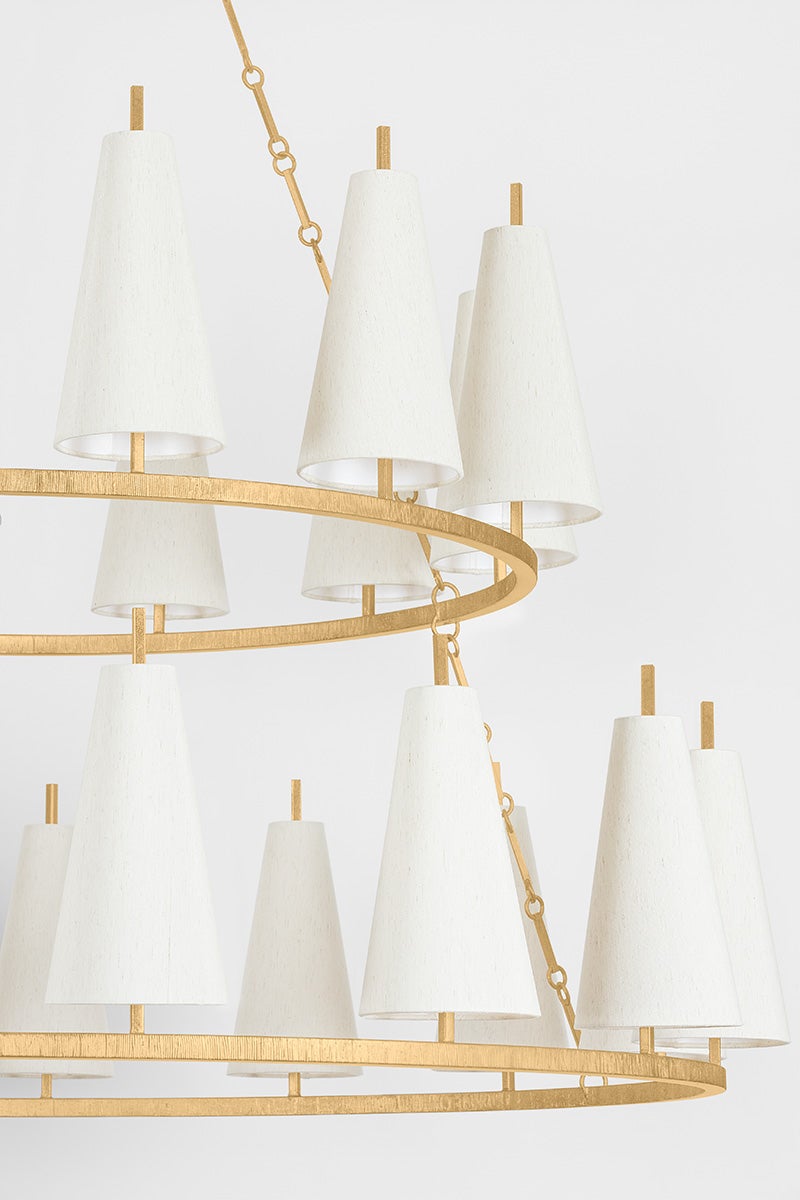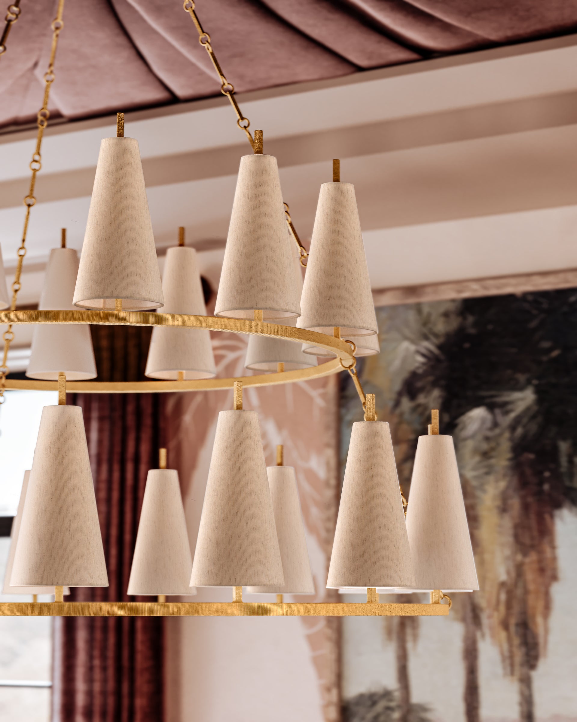 While simplistic, the natural silk shades and circular motifs of the Tirana family nod to a nautical spirit. The conical shades provide a contemporary lightness to the traditional silhouettes. By contrast, the delicately textured Vintage Gold Leaf metalwork catches the light like a modish bangle bracelet. Available as a 1-light sconce and a 12-light, 15-light, and 27-light chandelier, Tirana produces warm, refined lighting for transitional spaces.