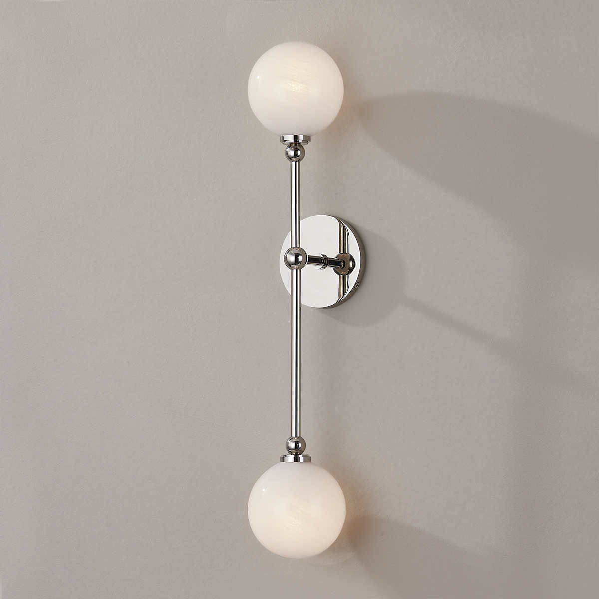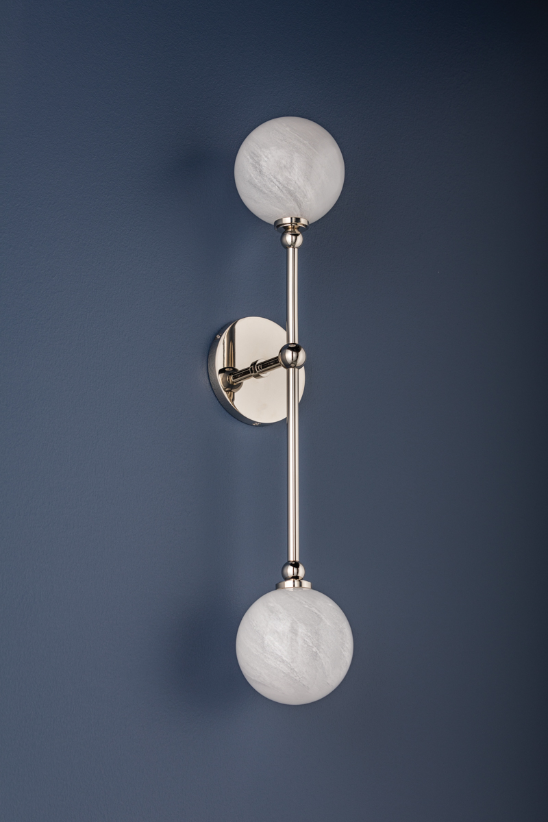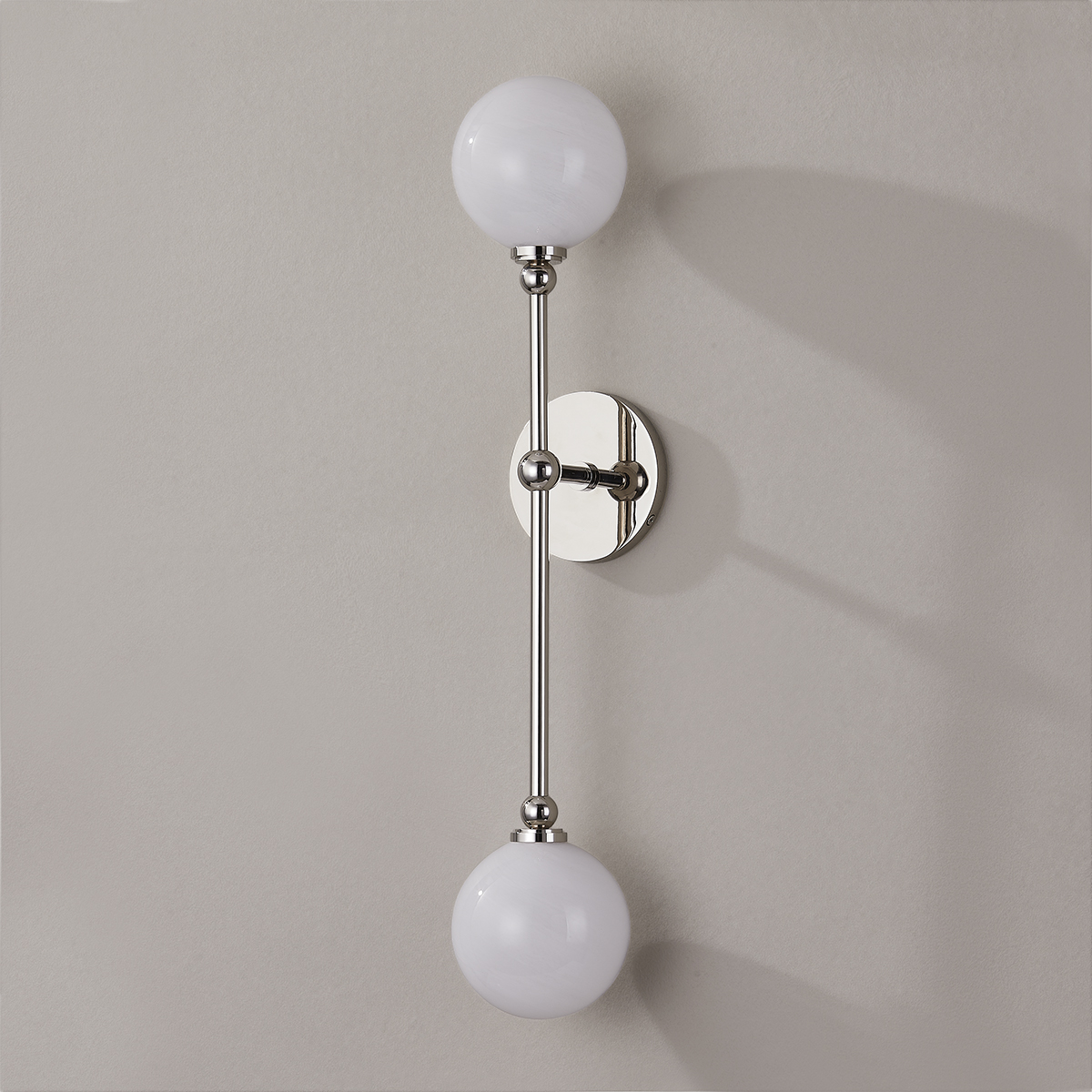 Cloud etched glass globes cap slender baton-like Aged Brass arms, adorned with matching metal orbs, to create a streamlined modern design. As the name suggests, the cloud etched glass creates a wispy cloud-like pattern inside the glass globe shades that fills with a warm glow when lit. The sconce is also available in a Polished Nickel making it a good choice for the bath.