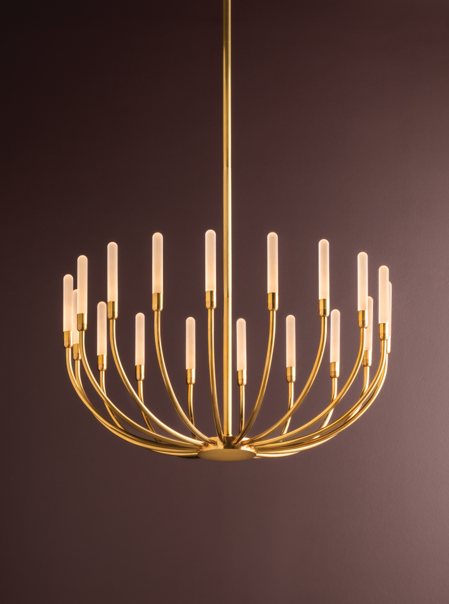 Defined by a poetic, gestural array of sweeping arms, the family of Amalthea is alluring and modern. Perched at the tip of each arm is a thin etched acrylic rod, end-lit with LED. While reminiscent of slender torches, the Vintage Brass branches also come across as organic. Each variation in this family, including a 3-light sconce and 18 or 30-light chandelier offers distinctive visual appeal while providing a lighting solution to meet the needs of your space.