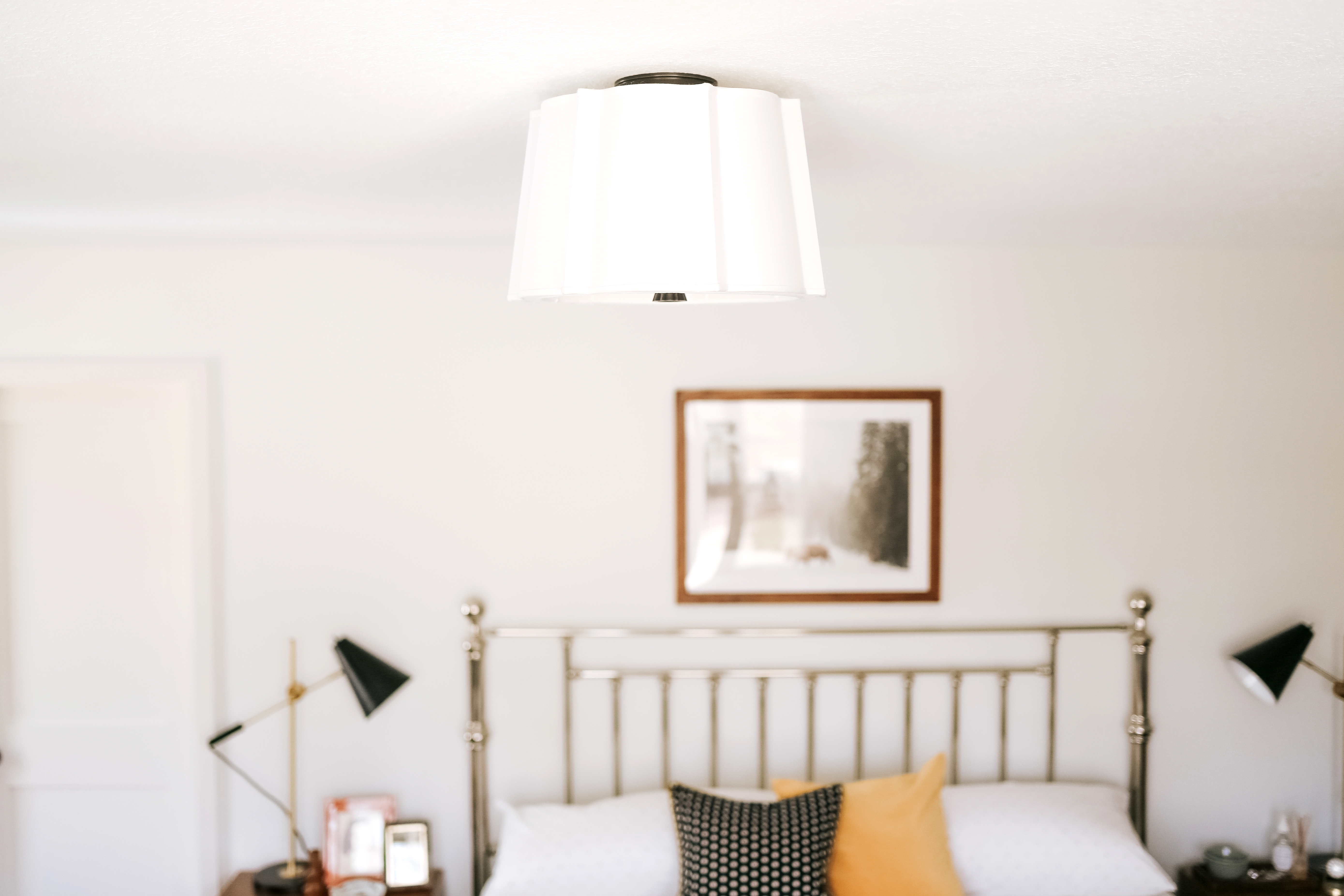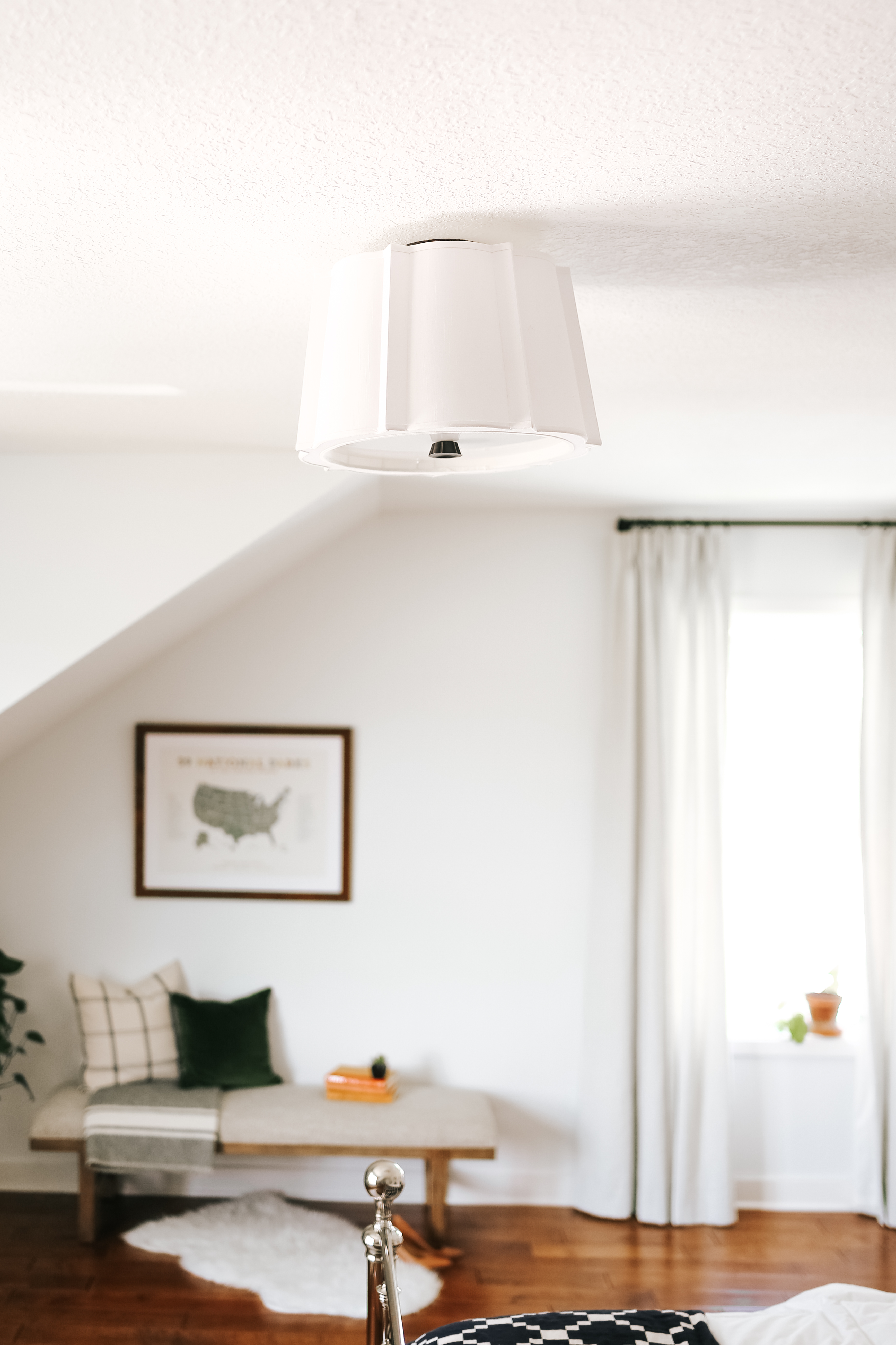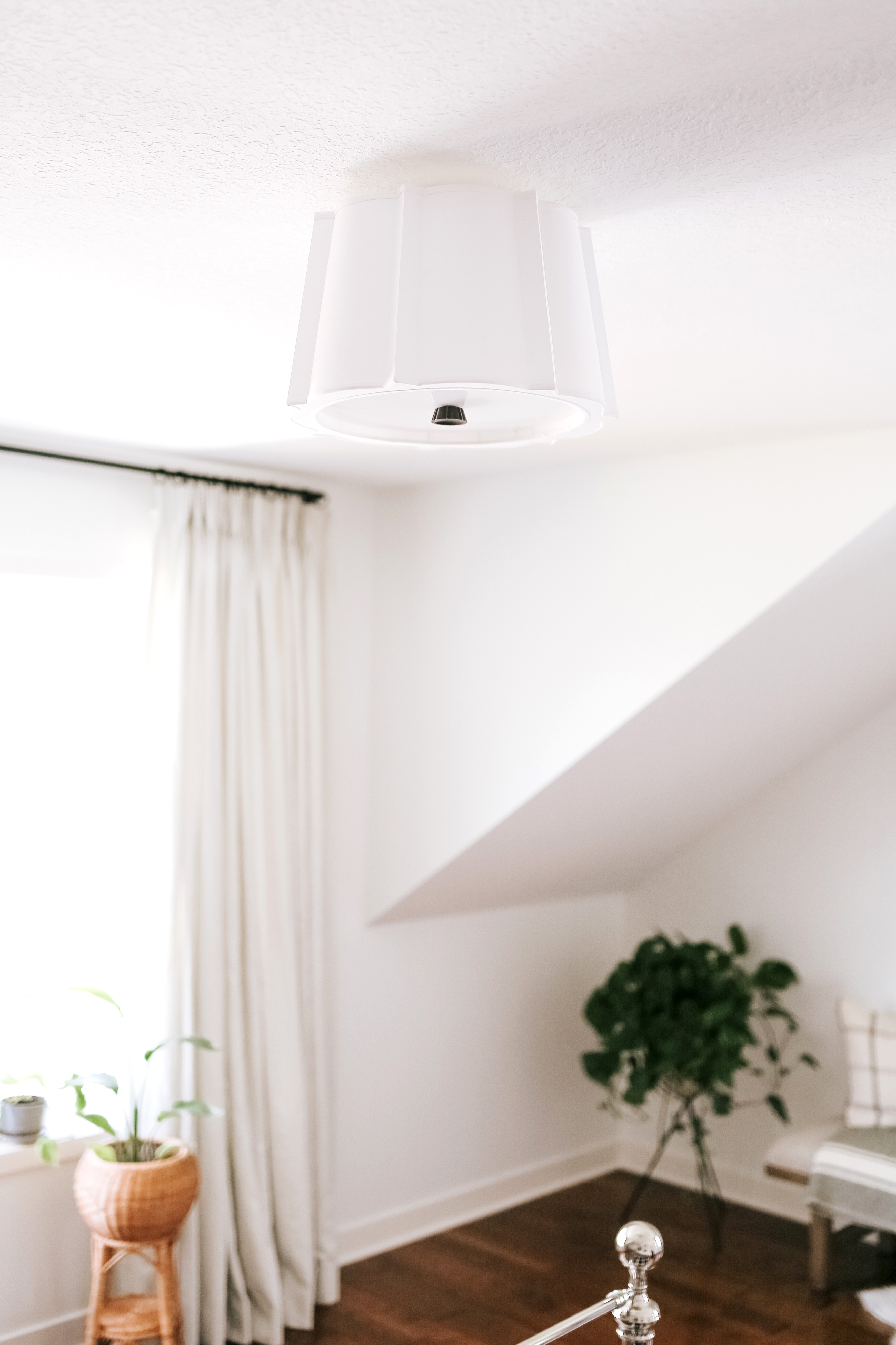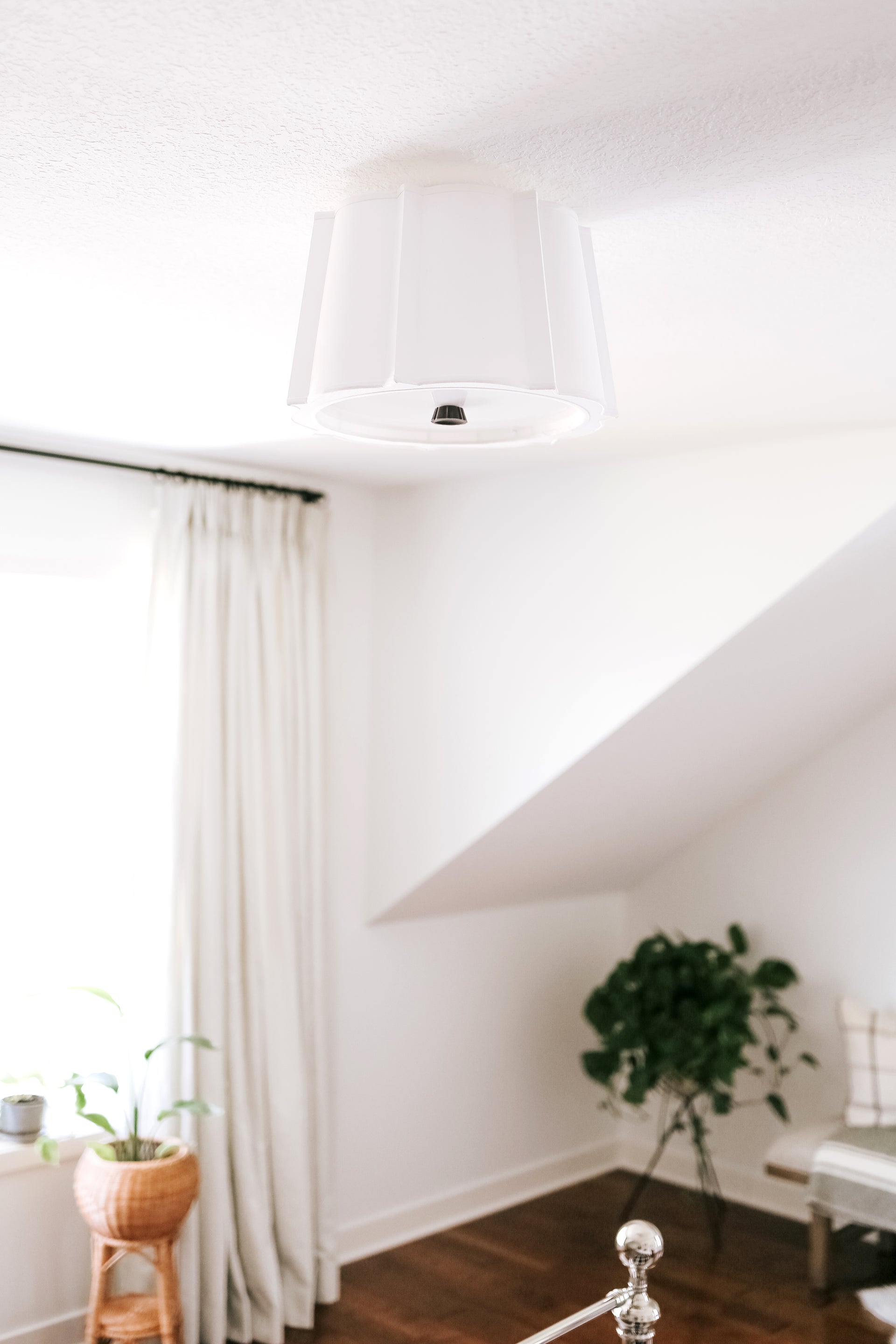 Swathes of soft white fabric alternate wide curve and narrow angle to create Humphrey’s intricate, unique shade. Humphrey’s cast metal canopies and finials match the shade’s elaborate shape.