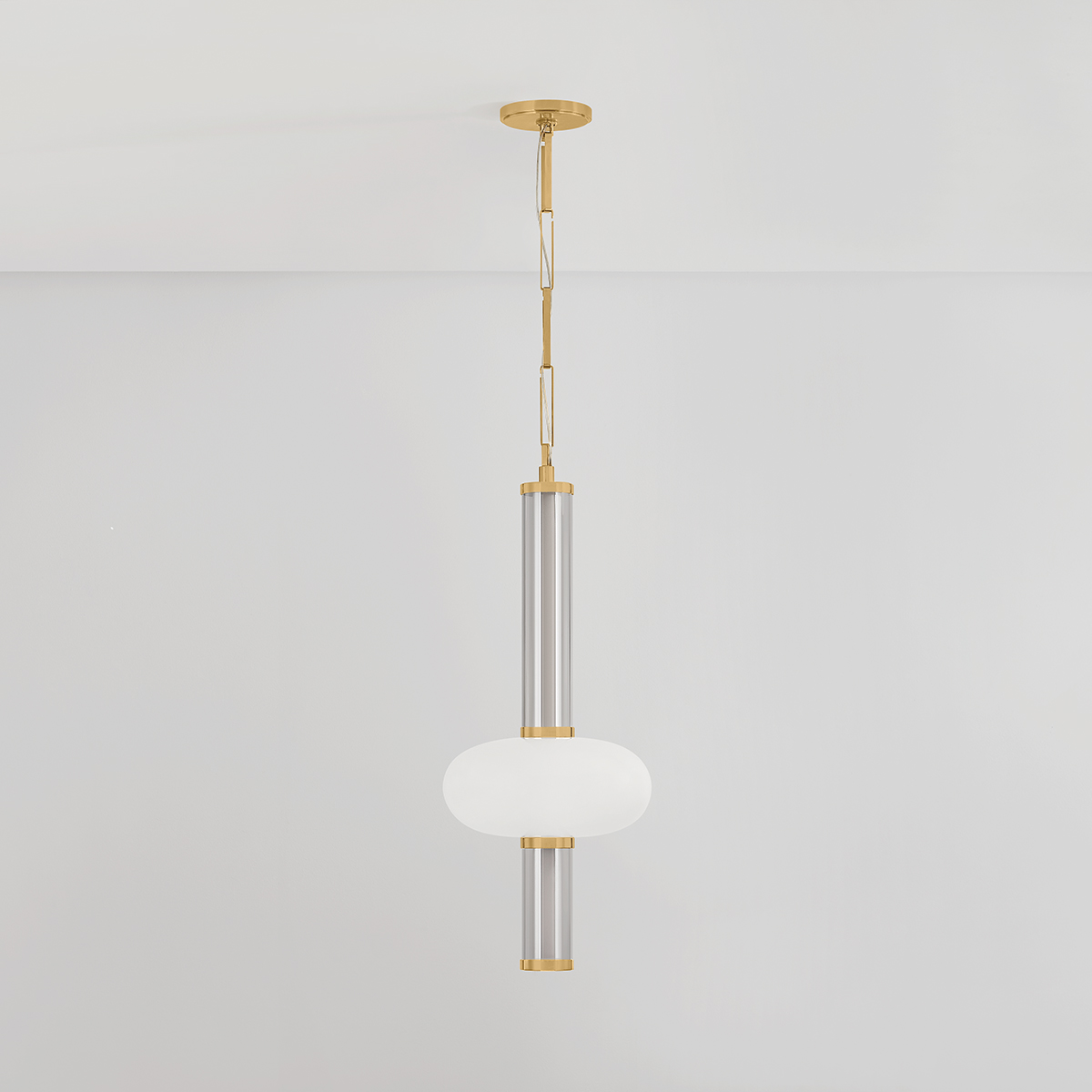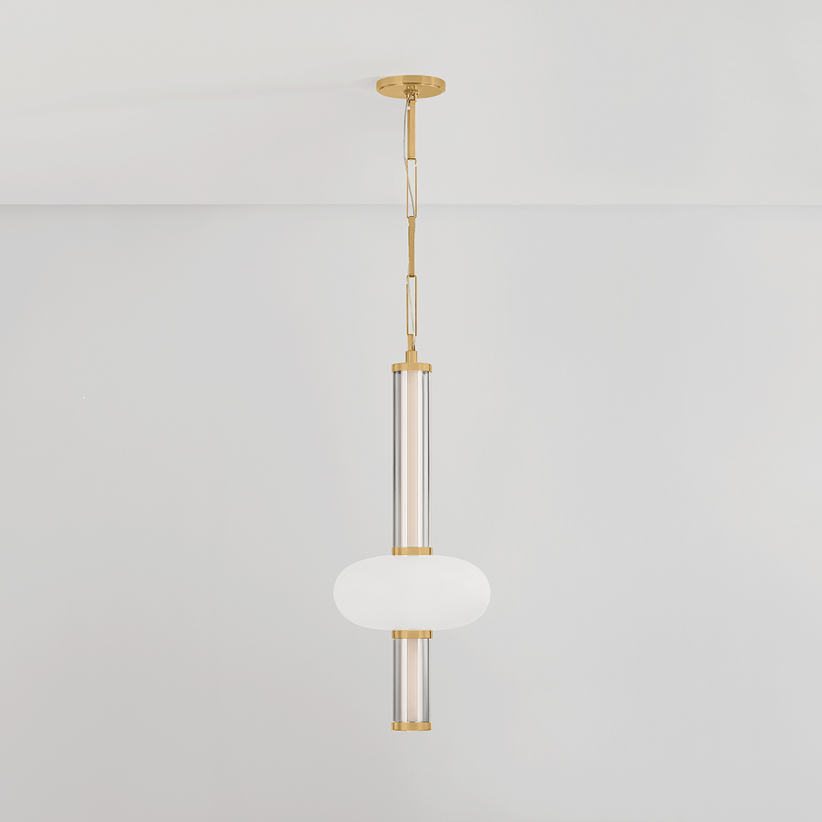 A study in layering, transparency, and colored glass techniques, Corbin has an ethereal windchime-like silhouette. The central tubes are accented by large oblong shades resembling beads on a necklace. These modern forms are enhanced by the use of clear and tinted ombre glass, which creates a stunning display when illuminated by the central LED tube. Corbin is available as a 1-light pendant, 1-light sconce, and 3-light chandelier.