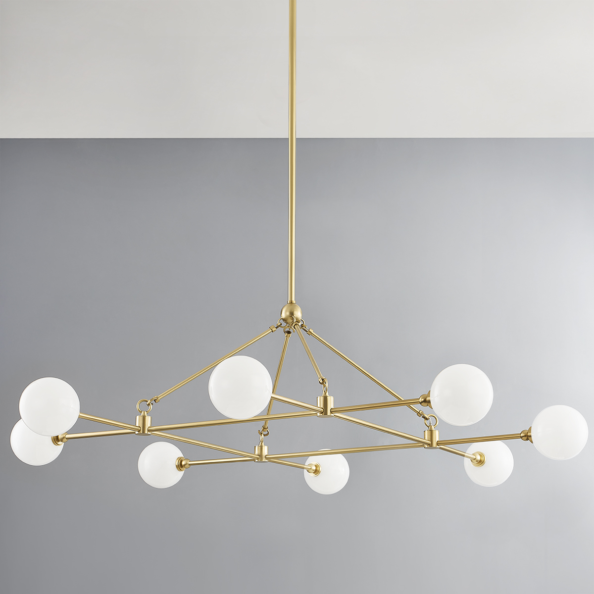 Cloud etched glass globes cap slender baton-like Aged Brass arms, adorned with matching metal orbs, to create a streamlined modern design. As the name suggests, the cloud etched glass creates a wispy cloud-like pattern inside the glass globe shades that fills with a warm glow when lit. The sconce is also available in a Polished Nickel making it a good choice for the bath.