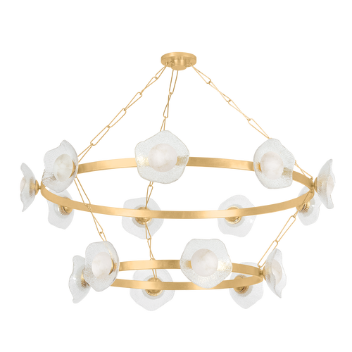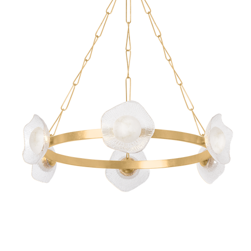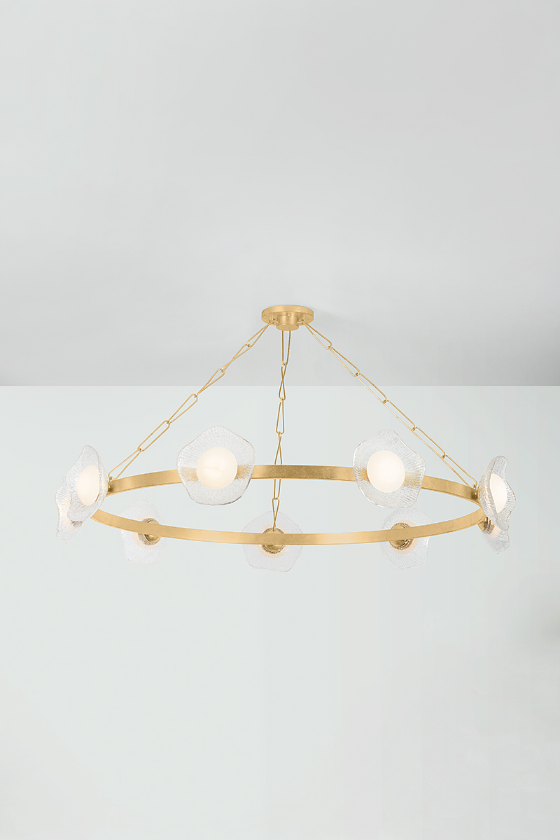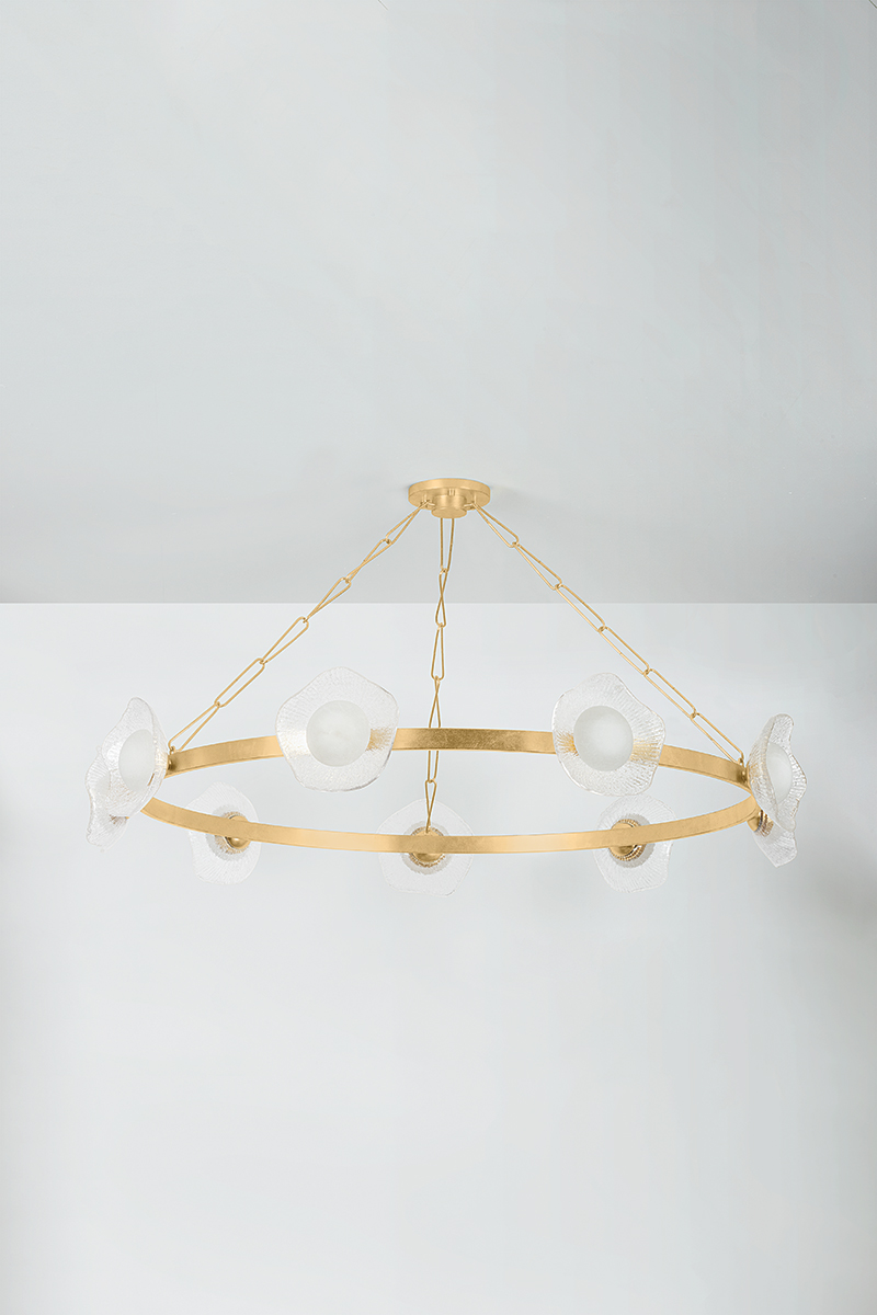 Combining organic and modern elements, Almandine is an elevated take on a traditional ring chandelier. The minimalist frame is accented with floral-shaped shades hand-cut from fluted piastre glass. Finished in Vintage Gold Leaf, the restrained metalwork allows the beauty of the blooms to shine. Almandine is available as a single-tier chandelier with 6 or 9 lights, a double-tier chandelier with 15 lights, and a single-light wall sconce.