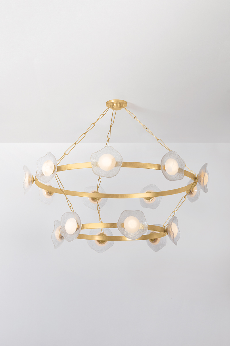 Combining organic and modern elements, Almandine is an elevated take on a traditional ring chandelier. The minimalist frame is accented with floral-shaped shades hand-cut from fluted piastre glass. Finished in Vintage Gold Leaf, the restrained metalwork allows the beauty of the blooms to shine. Almandine is available as a single-tier chandelier with 6 or 9 lights, a double-tier chandelier with 15 lights, and a single-light wall sconce.