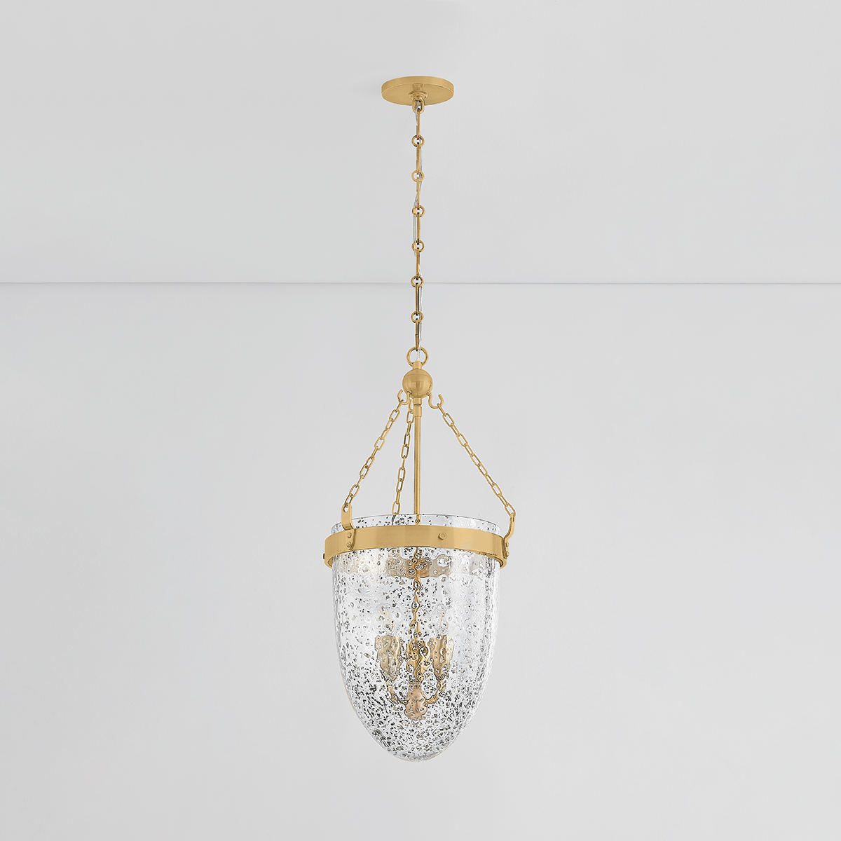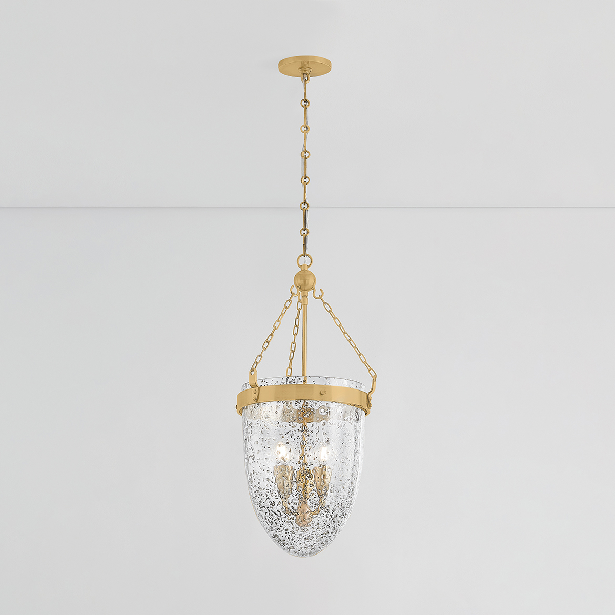 The clean lines, delicate chains, and statement drop shade of Angus offer a contemporary take on a lantern silhouette. The Mica glass shade is characterized by unique bubbles that give the surface a watery appearance. A Vintage Brass band with nodules anchors the fixture with an antique look. Available with 3 or 4 lights.