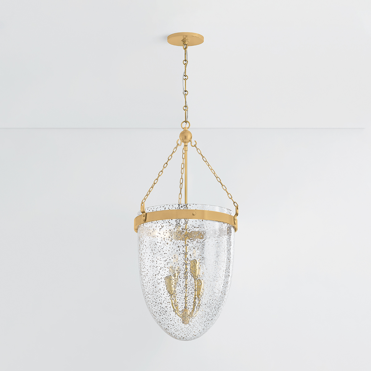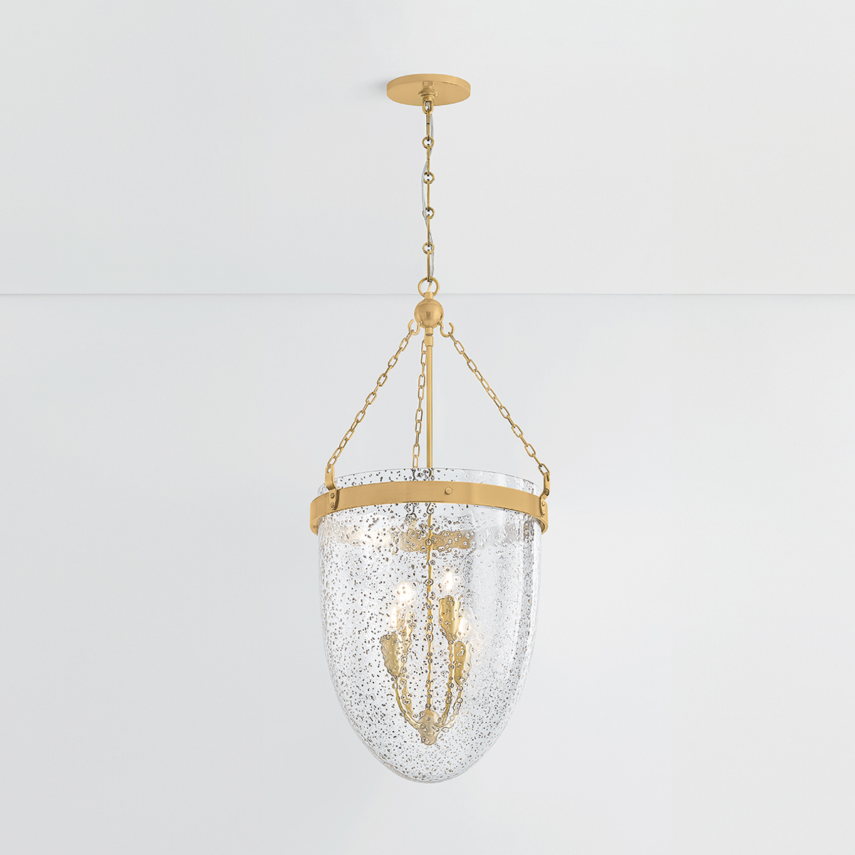 The clean lines, delicate chains, and statement drop shade of Angus offer a contemporary take on a lantern silhouette. The Mica glass shade is characterized by unique bubbles that give the surface a watery appearance. A Vintage Brass band with nodules anchors the fixture with an antique look. Available with 3 or 4 lights.