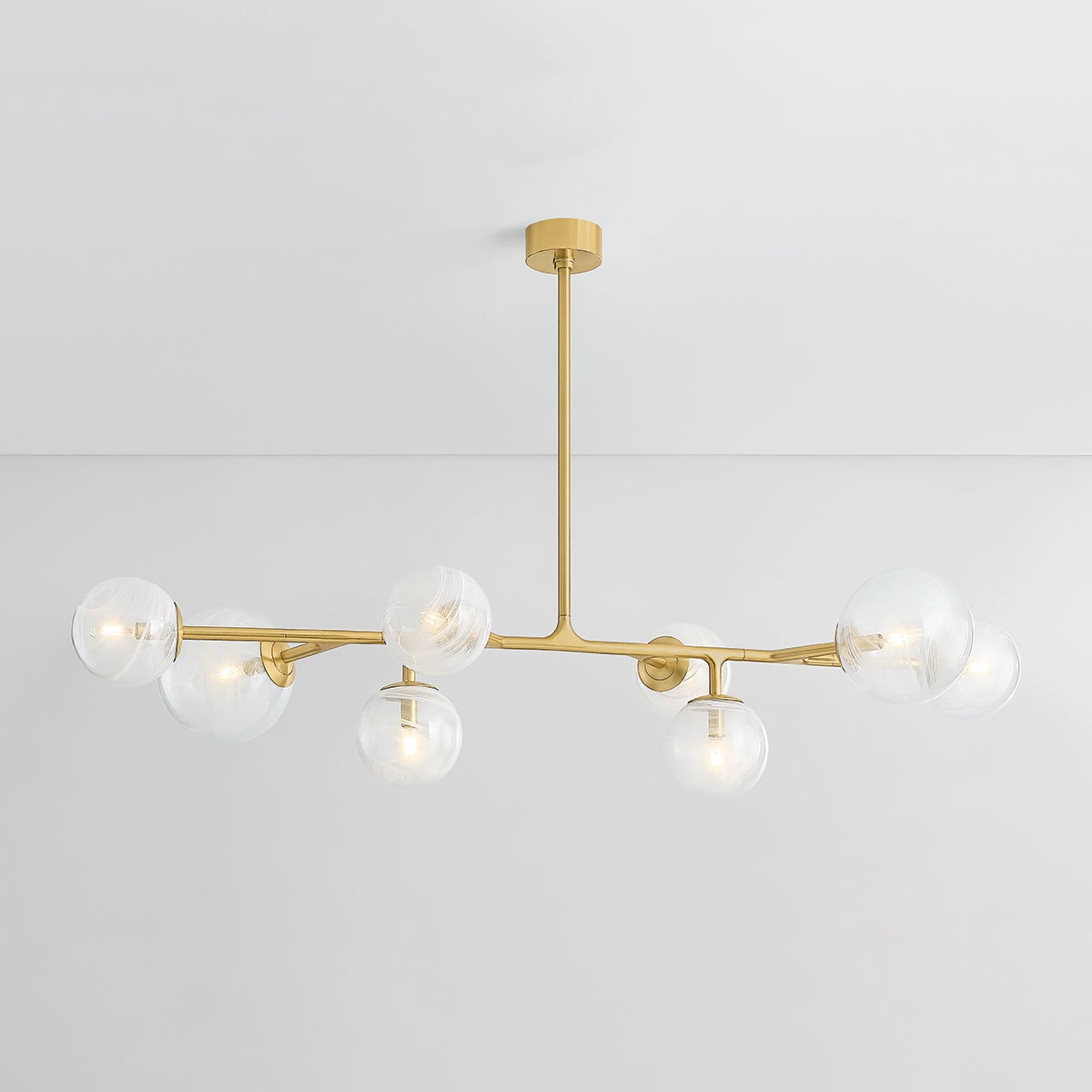 The Glasgow family of chandeliers and linears captures the old-meets-new vibrancy of its namesake Scottish city. Resembling celestial bodies in the night sky, the Remolino Blanco swirled glass globes are suspended from a branch-inspired Vintage Polished Brass frame. Choose from different formats to suit your space, from 8 to 24 lights.