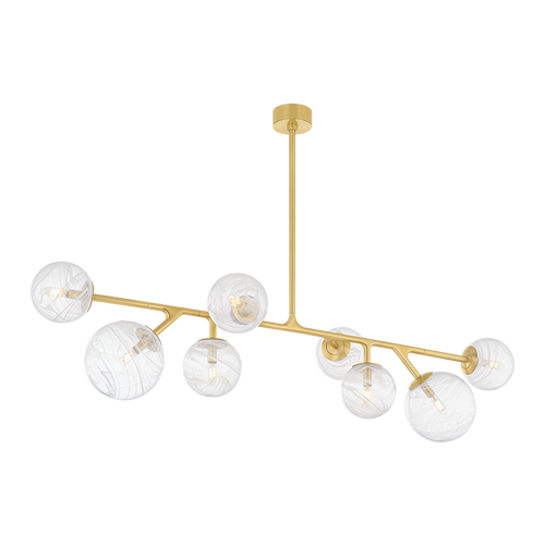 The Glasgow family of chandeliers and linears captures the old-meets-new vibrancy of its namesake Scottish city. Resembling celestial bodies in the night sky, the Remolino Blanco swirled glass globes are suspended from a branch-inspired Vintage Polished Brass frame. Choose from different formats to suit your space, from 8 to 24 lights.