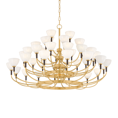 Modern with a historical reference, the Brahma family uses scale and repetition to create a stunning maximalist statement. The contrasts between the Vintage Brass and Bronze metalwork add visual interest, while the stacked tiers create a grand look. The central rings of the fixture support gracefully branching arms with milky cloud glass shades, contributing to the majestic presence of this chandelier. Whether you choose the 25 or 44 light option, Brahma makes an impressive addition to any space.
