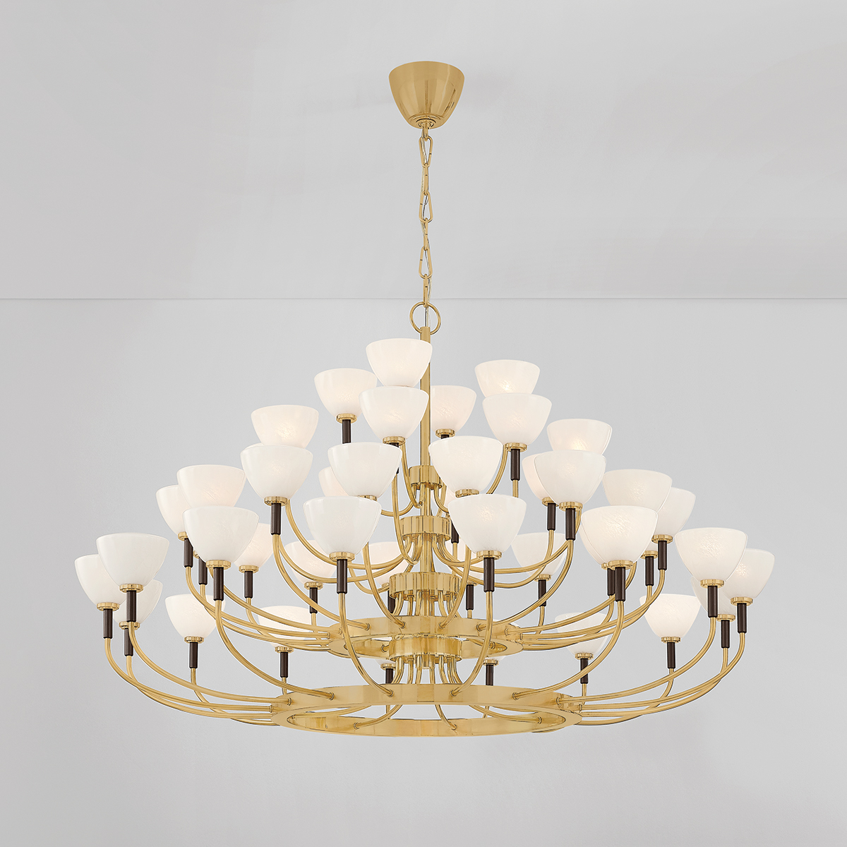 Modern with a historical reference, the Brahma family uses scale and repetition to create a stunning maximalist statement. The contrasts between the Vintage Brass and Bronze metalwork add visual interest, while the stacked tiers create a grand look. The central rings of the fixture support gracefully branching arms with milky cloud glass shades, contributing to the majestic presence of this chandelier. Whether you choose the 25 or 44 light option, Brahma makes an impressive addition to any space.