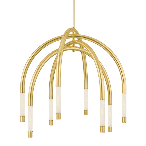 The modern mobile-inspired Dashiell chandelier is designed to spark conversations. While constructed of substantial materials, this chandelier maintains a light, balanced appearance with an innate sense of movement. Slender Vintage Polished Brass arms are capped with tapered cylindrical alabaster shades, adding a note of contrast to the upscale fixture. The distinctive fluted holders of the shades provide additional style. Illuminated by LED, Dashiell is available in two sizes.