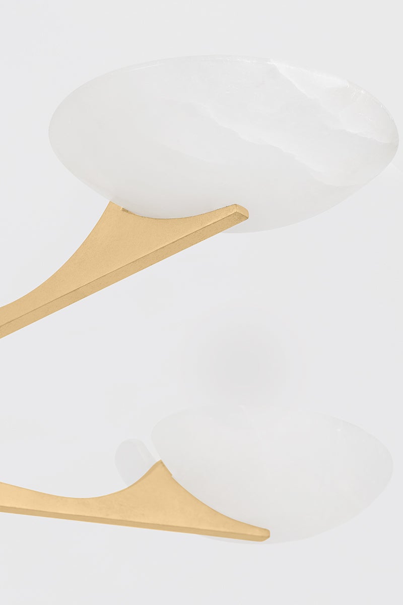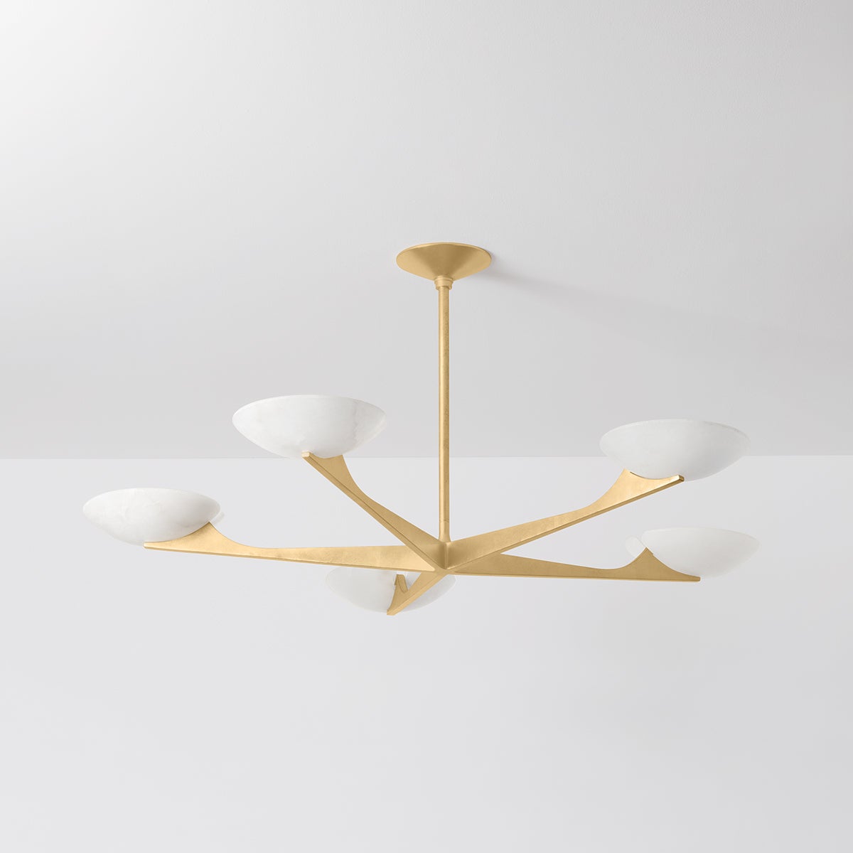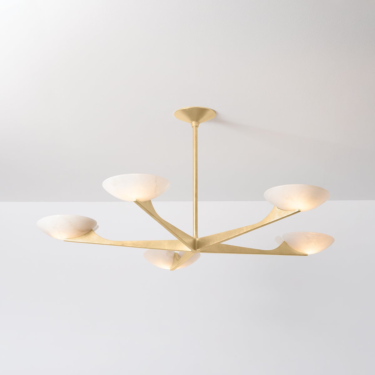 Embracing modernism with elevated materials, Malachite is a versatile chandelier for living and dining spaces. Arrayed evenly from a center point, each arm on the fixture culminates in a 10” bowl shade filled with light. The combination of natural alabaster and Vintage Gold Leaf results in a luxurious finish. Malachite is available with 3 or 5-lights.