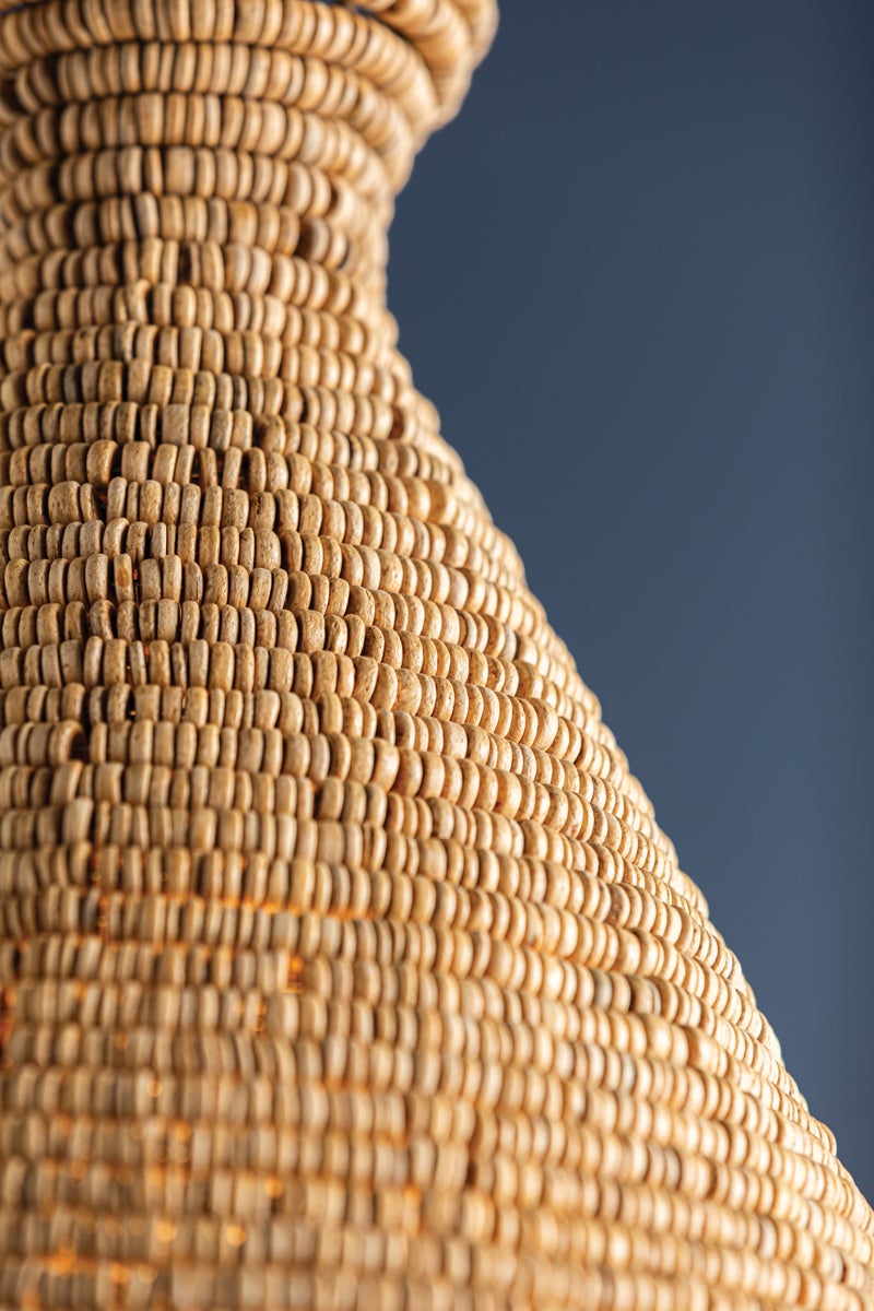 Handcrafted with natural wood beads, the conical shade of Tallman demonstrates artisanal finesse. It combines the fresh, organic materiality of the wood with the timeless elegance of a Vintage Gold Leaf chain. Available in two sizes, one with a slender profile and the other presenting a true cone shape, Tallman brings a fresh infusion of energy to kitchen counters or a dining room table.
