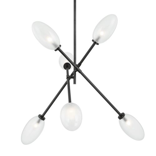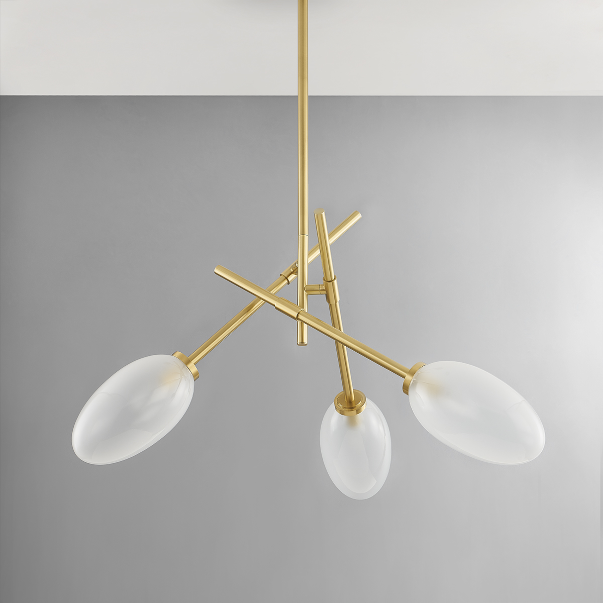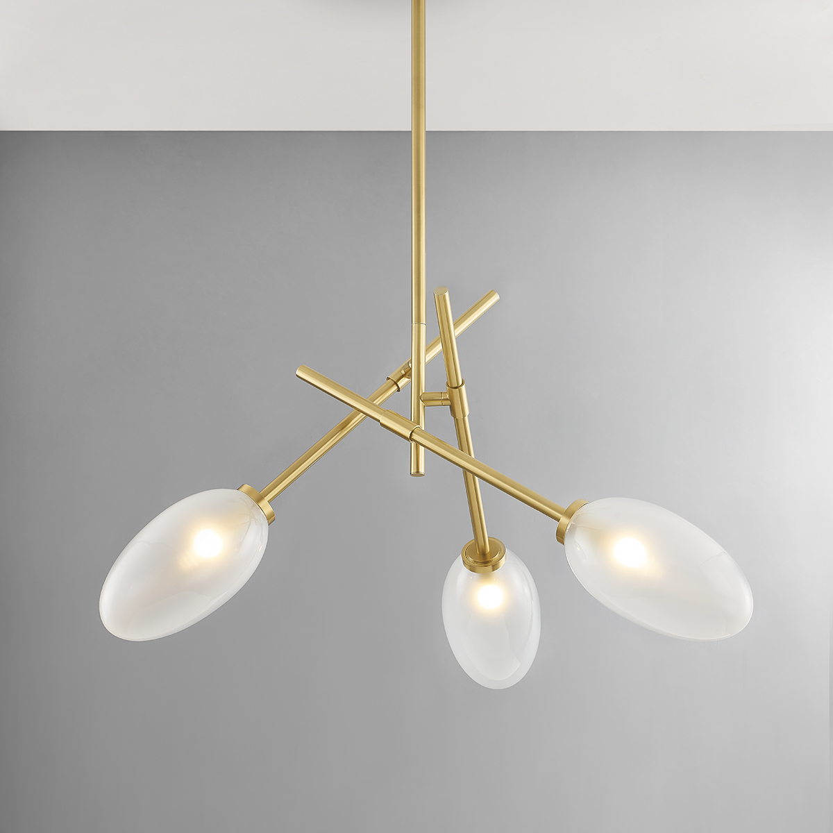 Alberton reinvents the familiar sputnik silhouette as a modern dynamic statement piece. Elongated clear etched glass shades suspend from rotating metallic arms in Aged or Black Brass to create a piece of utilitarian art that is as beautiful as it is functional.