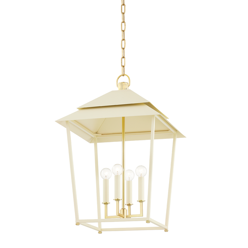 Natick is clean, open, and airy. The double roofline stands out from a traditional lantern, while the Aged Brass metal feet and squared arms add to the unique quality of the piece.